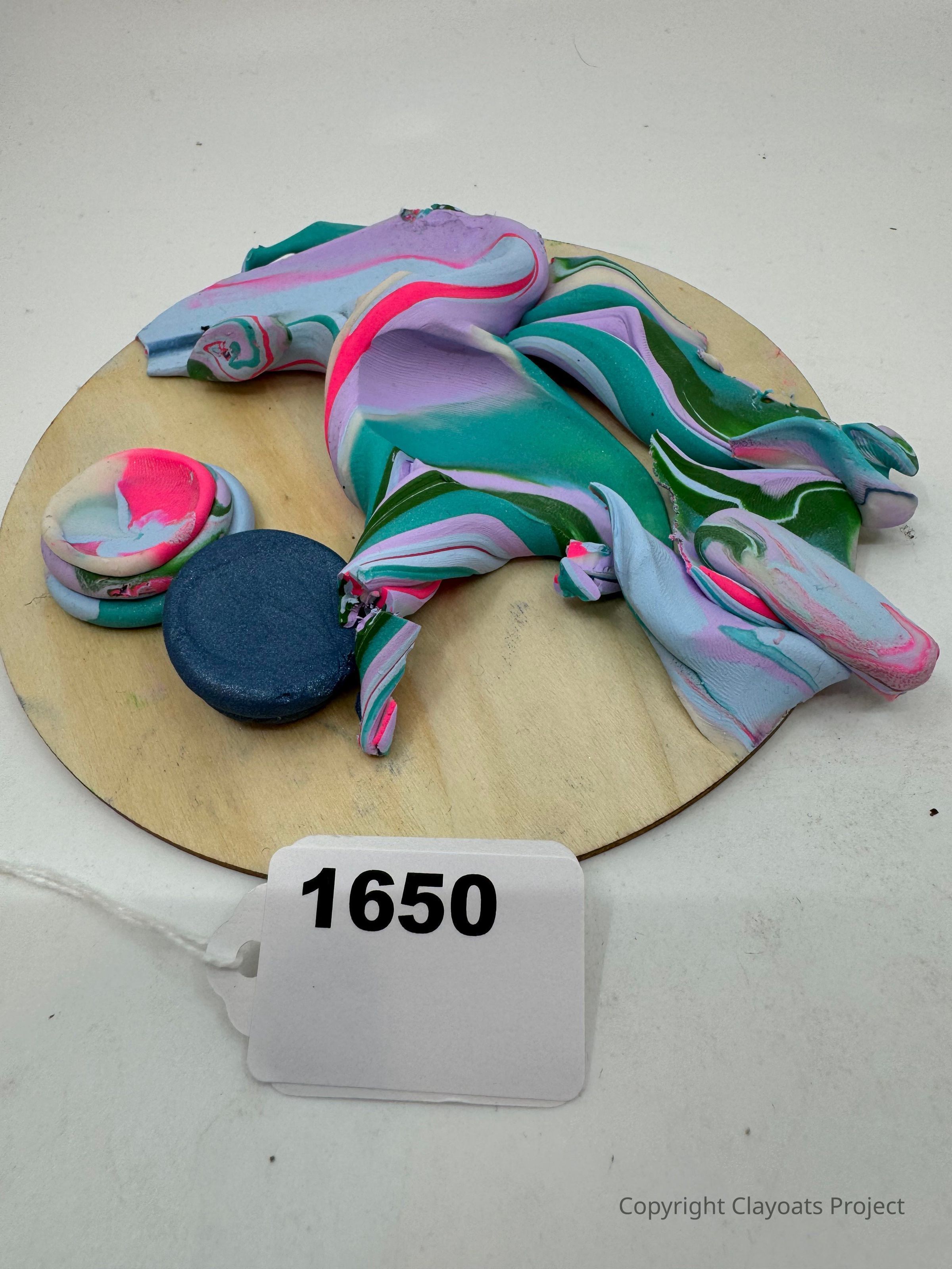 The image features a wooden circular base displaying colorful clay objects with a marbleized pattern in shades of pink, blue, green, and white. The arrangement includes multiple pieces, each uniquely shaped, resembling twisted and flattened forms. At the forefront, there is a small circular piece in dark blue alongside another layered piece. The overall composition presents a vibrant mix of colors and