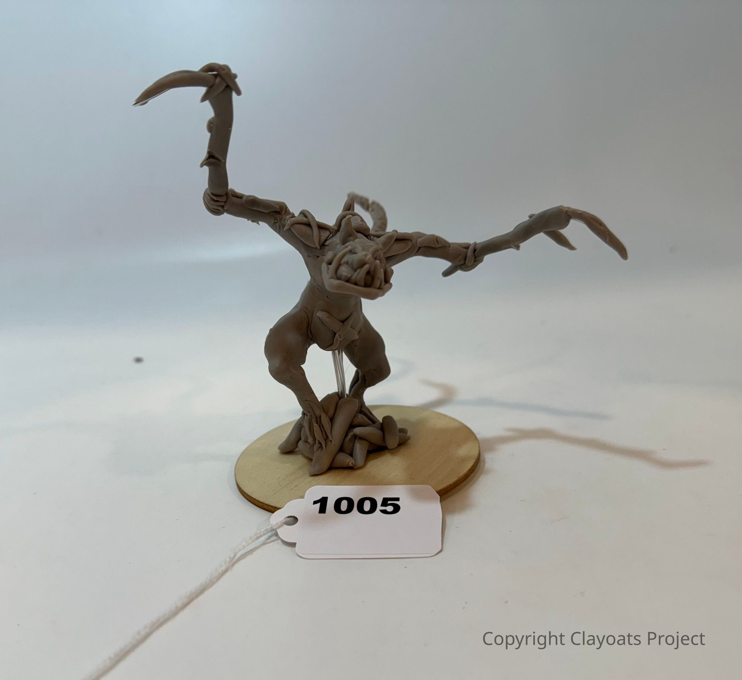 The image shows a clay sculpture of a fantastical creature with elongated limbs and claw-like hands, standing on a circular wooden base. It has a dynamic posture and appears to be in motion, with its arms raised and mouth open, as if growling or ready to attack. The creature's face is detailed with sharp features and its body appears muscular and slightly hunched over, emphasizing its menacing and expressive stance.