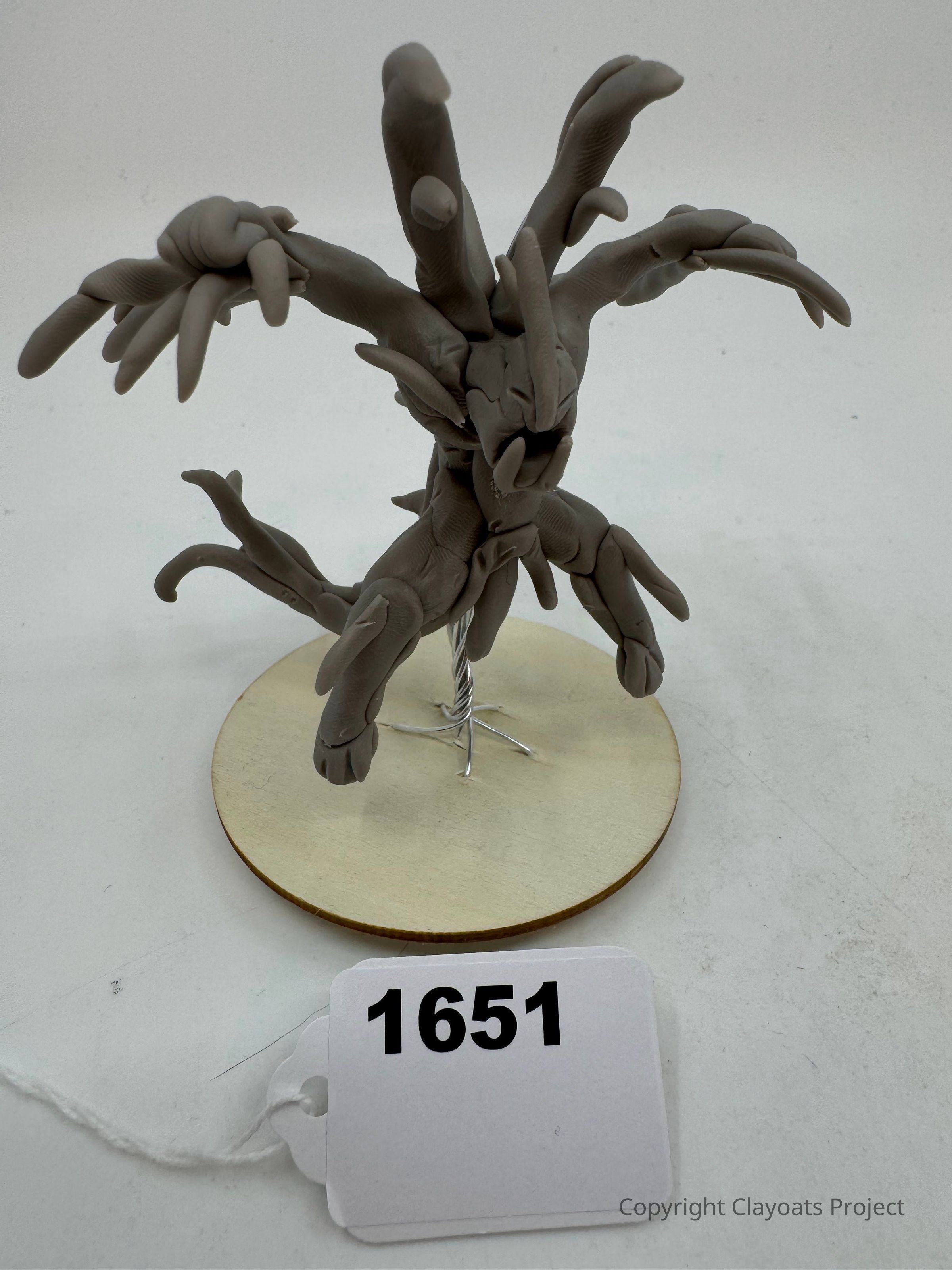 The image displays a clay sculpture of an abstract, organic structure with multiple elongated appendages extending in various directions, resembling branches or tentacles; it is mounted on a round wooden base featuring a wire support, highlighting the piece's unique and intricate design against a plain, light background that emphasizes its creative form.