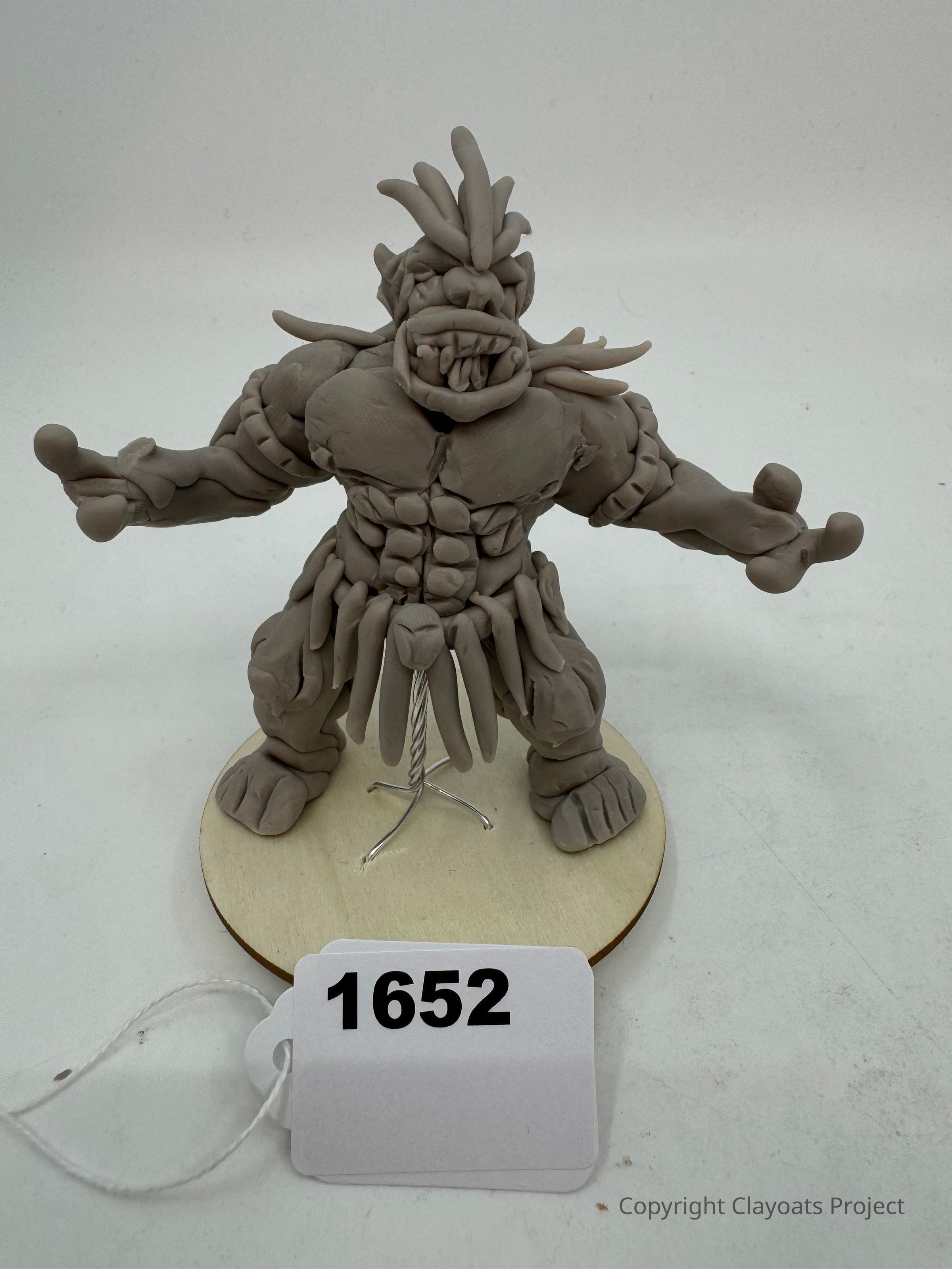 The image depicts a clay model of a fantastical creature with exaggerated features, such as large teeth and protruding spikes on its head. It stands on a circular wooden base, with its muscular arms extended outward in a dynamic pose. The creature's body is adorned with textured details that resemble armor or scales, contributing to its formidable appearance. The overall scene sets a creative, artistic tone, showcasing the intricate craftsmanship and imaginative design.