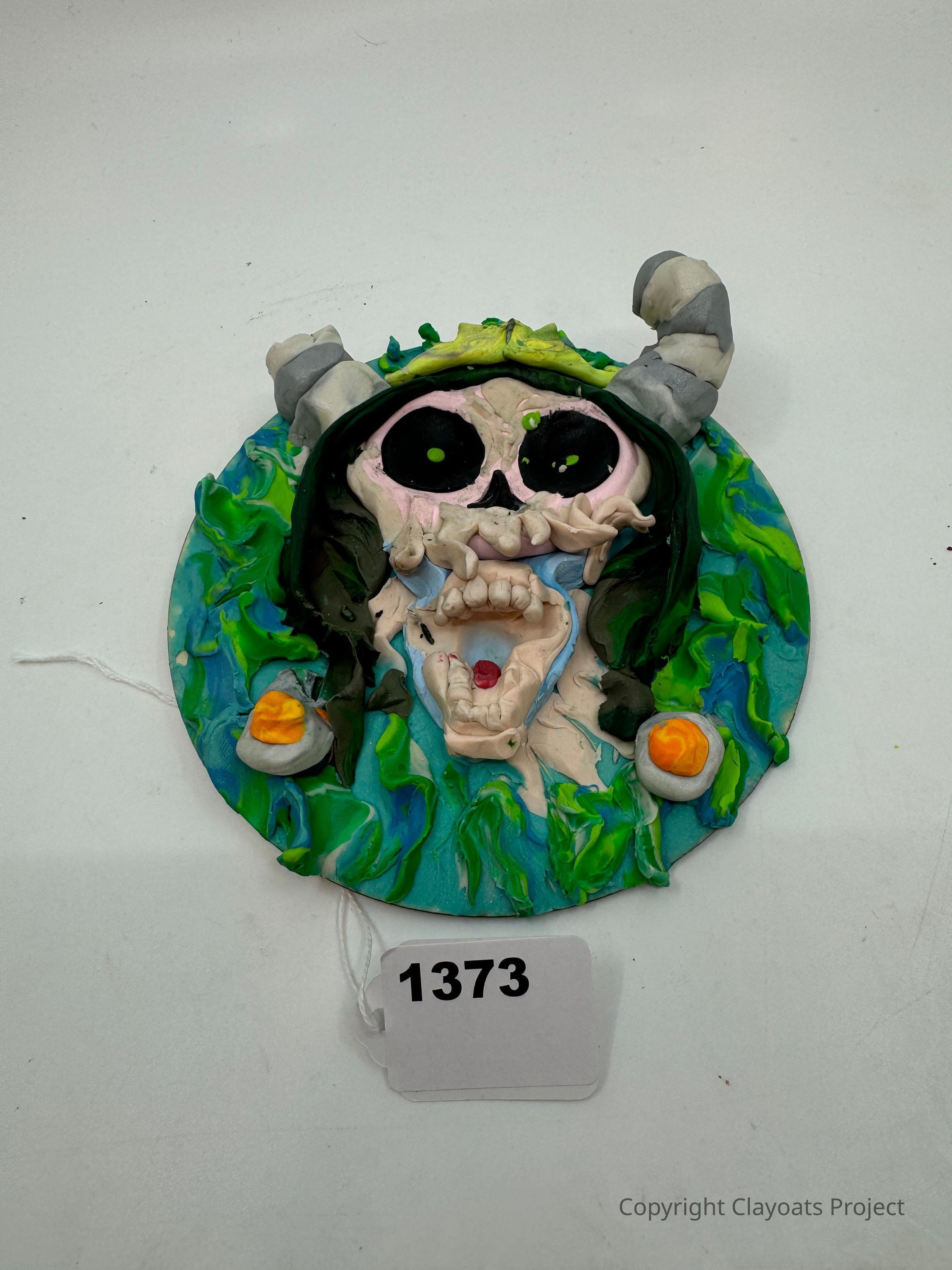 The image features a vibrant, intricate clay sculpture depicting a skull with exaggerated features, large black eyes, and curled horns, set against a circular background with swirling green, blue, and yellow patterns, creating an otherworldly, fantasy-like appearance;