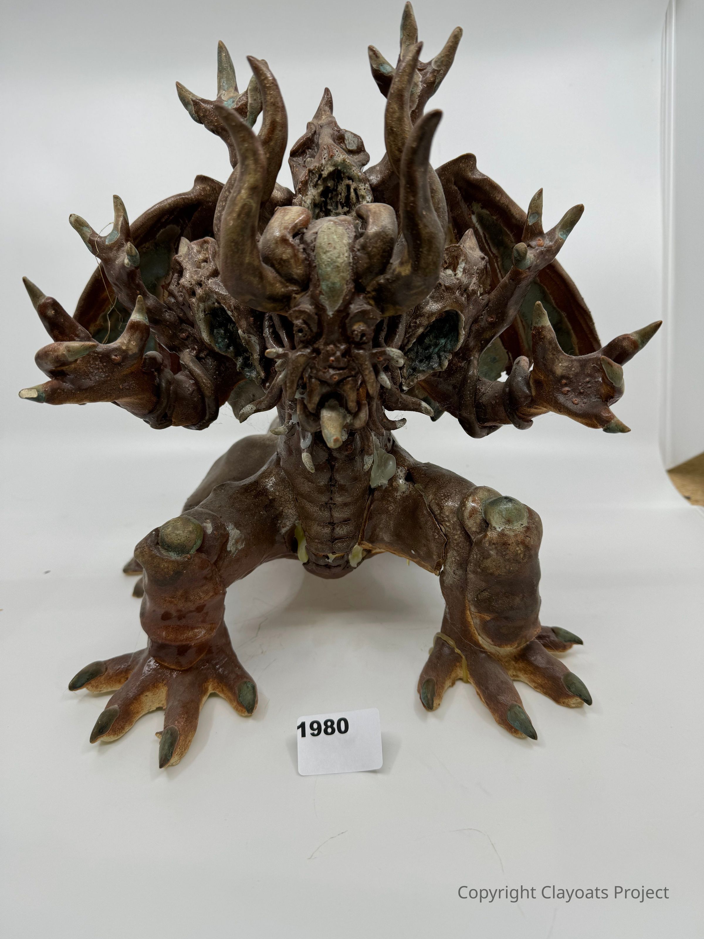 The image features a detailed sculpture resembling a fantastical mythical creature with horns, clawed limbs, and a textured, rugged surface, sitting on a white background. The sculpture, made with intricate attention to detail, displays an intense, fierce expression with wide horns extending from the head, adding to its dramatic and elaborate design.