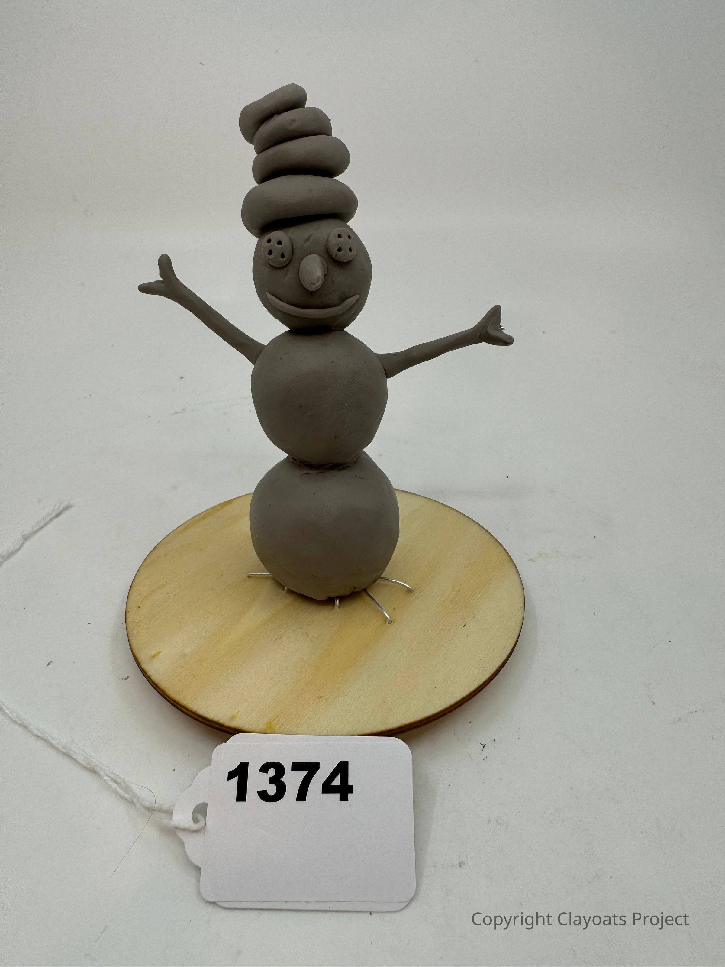 The image depicts a whimsical clay sculpture resembling a snowman with three round, stacked sections forming its body, placed on a circular wooden base. The topmost sphere features an expressive face with a prominent nose, smiling mouth, and eyes dotted with small circular indents. The sculpture's head is adorned with a whimsical, spiraled top hat made from coiled clay. Its outstretched arms add a playful element, as they appear to reach outward joyfully.