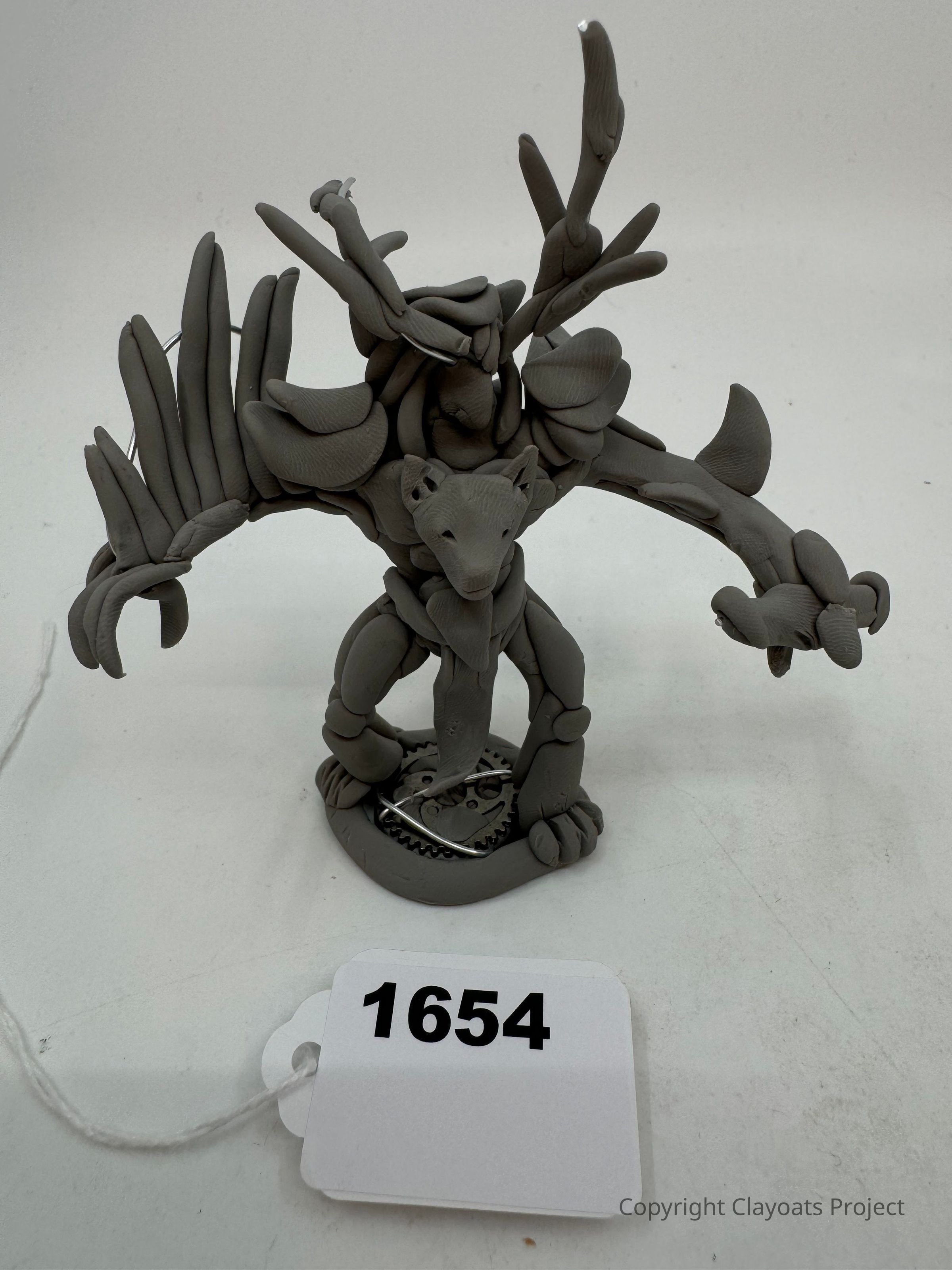 The image shows a gray clay sculpture of a fantastical creature with multiple elongated and pointed limbs, standing on a base with textured details resembling gears. The creature has a face with pronounced features, resembling both animal and humanoid characteristics. It displays an impressive and dynamic pose, with its arms spread wide and various appendages extending from its body, suggestive of organic or plant-like elements.