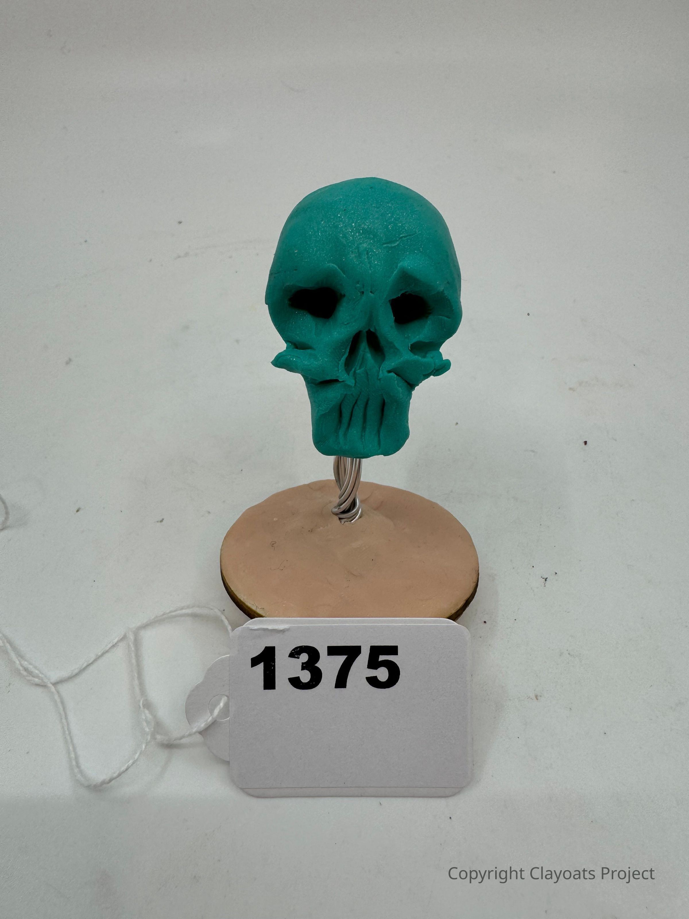 The image shows a teal-colored skull sculpture mounted on a wire stand, which is attached to a round base. The base appears to be a clay or cork-like material. The background is a plain, light gray surface, contrasting with the vibrant color of the skull, making it stand out prominently in the composition.