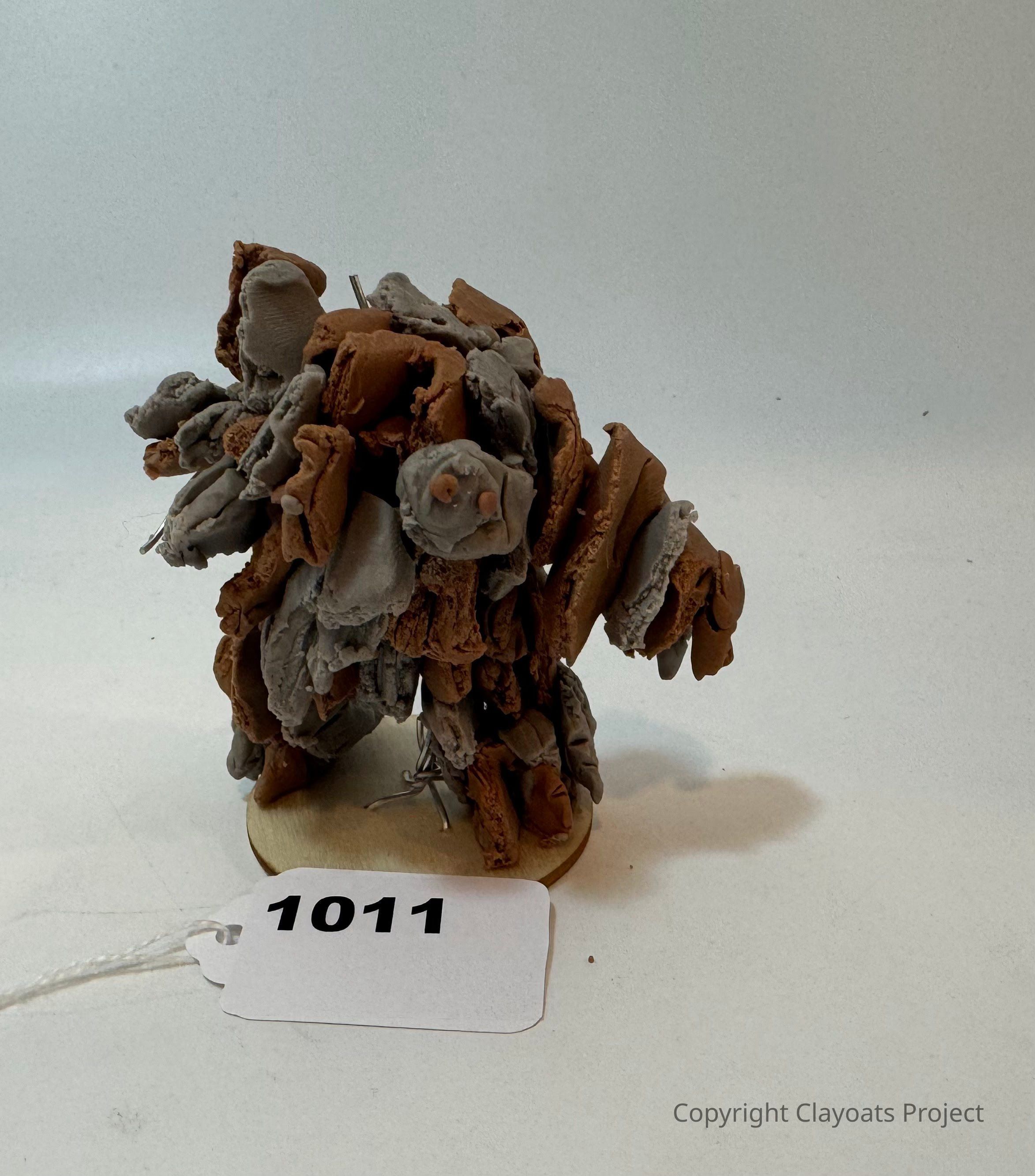 The image features a roughly textured sculpture made of brown and gray clay pieces, arranged in a way that resembles a creature or abstract form, standing on a circular base and the background is a plain, light color which accentuates the unique details and textures of the artwork, giving it a striking and unusual appearance.