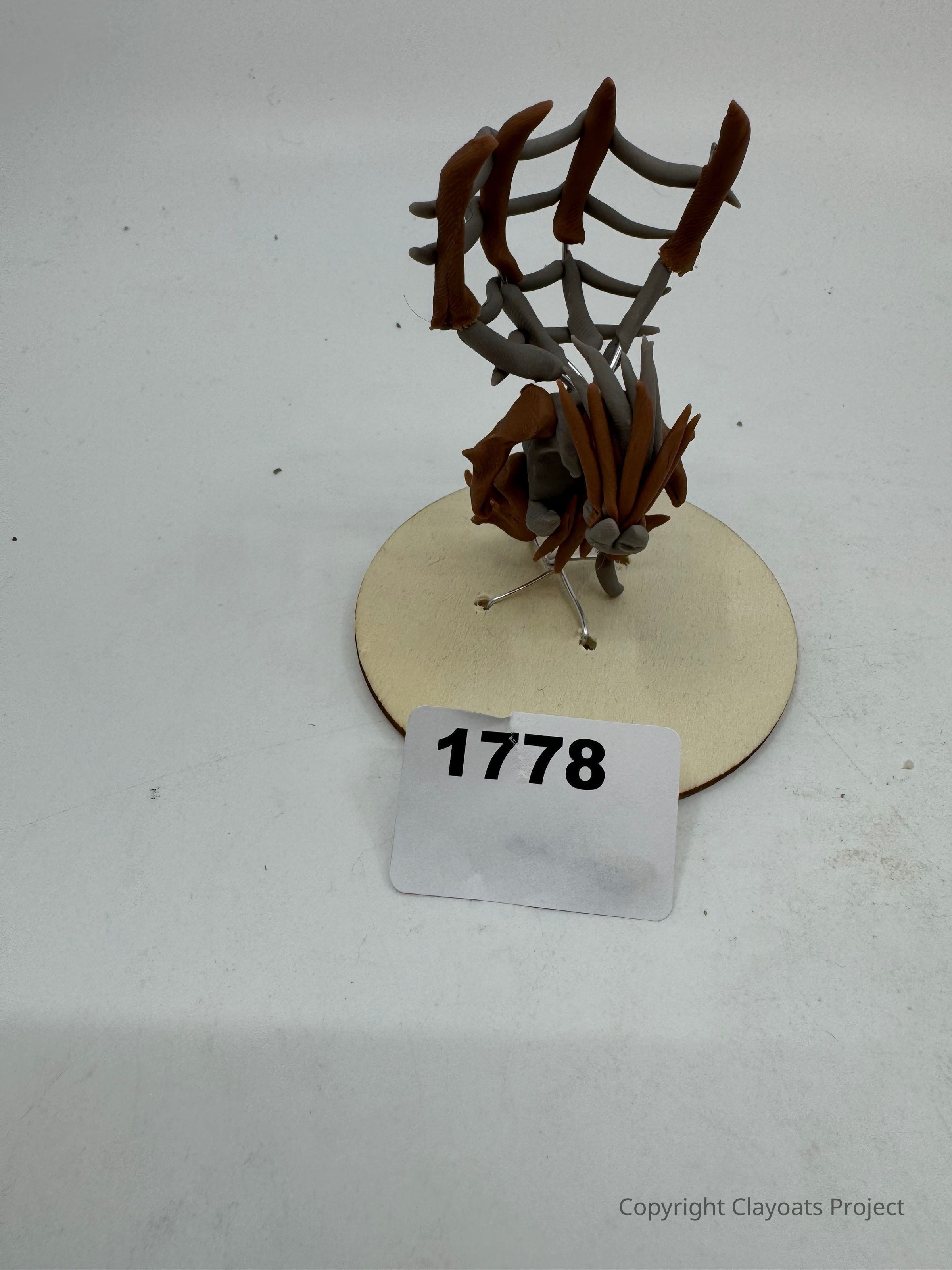 The image features a handmade model resembling a skeletal structure, crafted from brown and gray materials, resting on a circular wooden base.