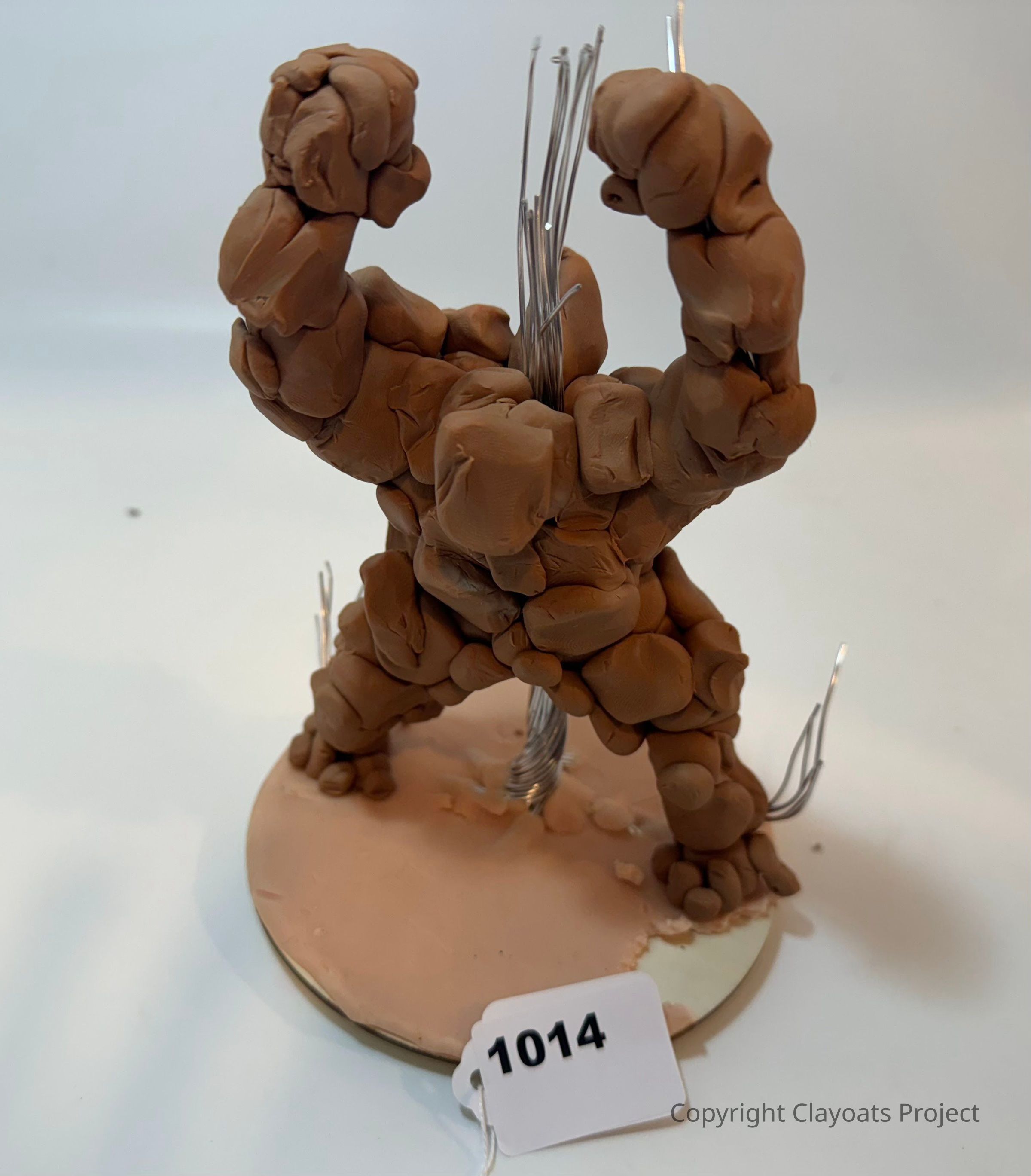 The image shows a small clay sculpture resembling a rugged, rock-like humanoid figure with raised arms, displayed on a circular base, and featuring visible metal wires protruding from the top and parts of the body that enhance its structured appearance, placed against a plain white background, which highlights the artwork's intricate textural details and gives an impression of dynamic strength and movement in its stony form.