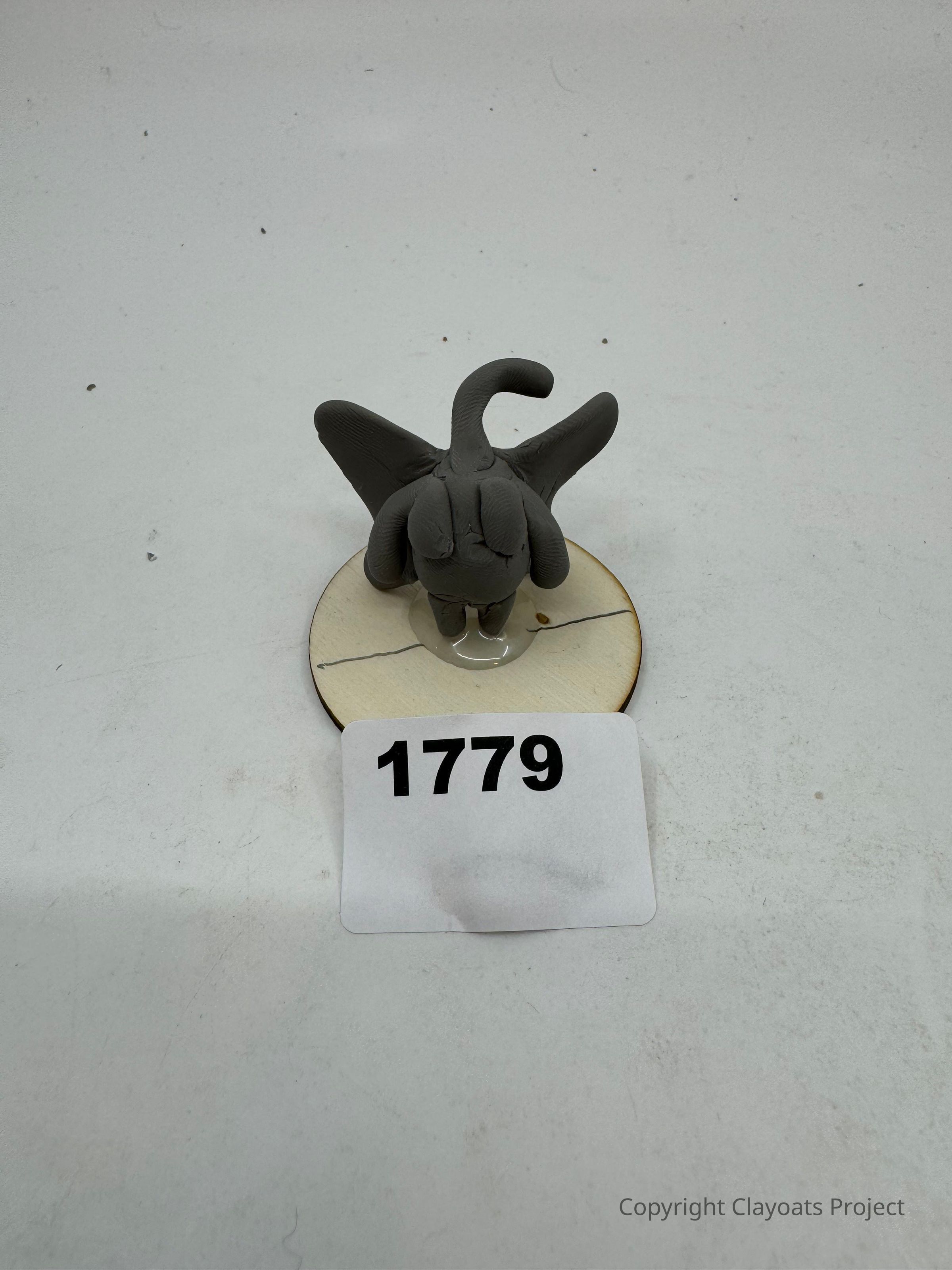 The image depicts a small, gray, clay sculpture of a creature with three tentacle-like appendages and two wings on a light circular base.
