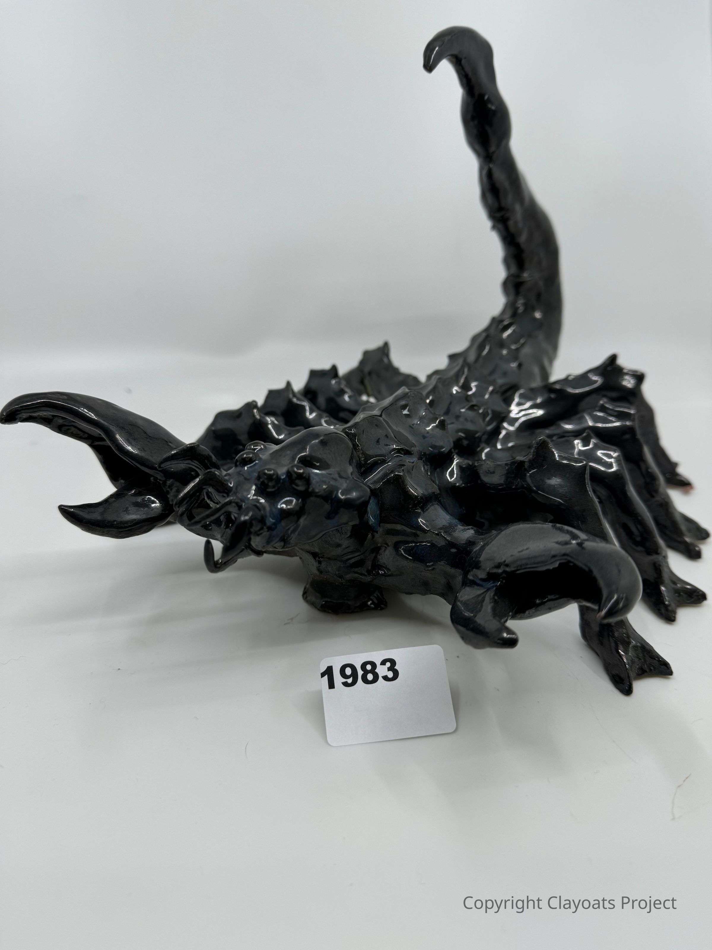 The image depicts a glossy black ceramic sculpture of a scorpion, characterized by its detailed texture and distinct features like the curved tail poised upwards and the large pincers at the front; beneath the sculpture lies a small, white rectangular card bearing the number 1983, placed on a smooth, light-colored surface, giving the sculpture a dramatic and polished appearance while highlighting its artistic craftsmanship and intricate design.