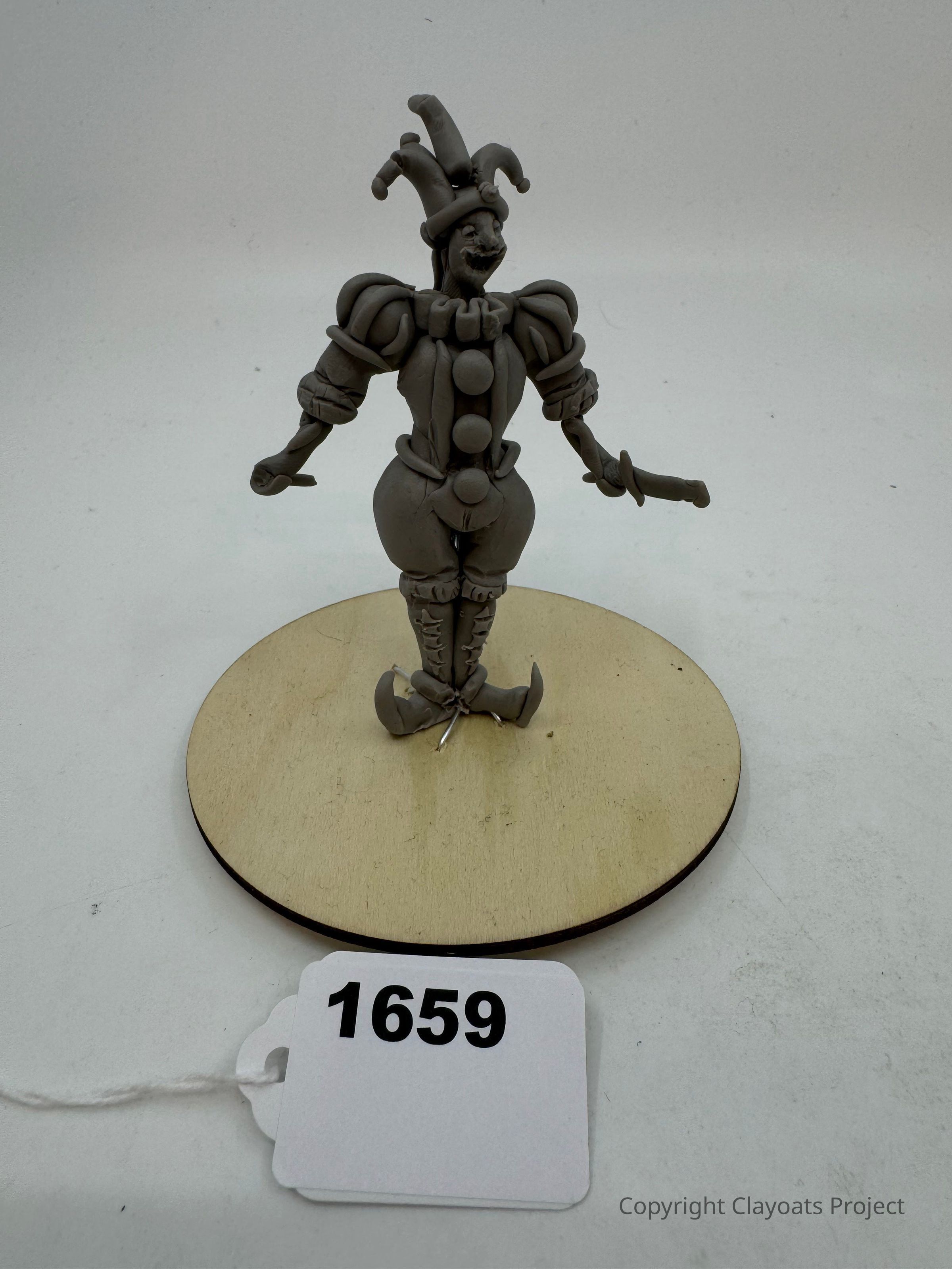 The image depicts a clay jester figure standing on a round wooden base, showcasing its exaggerated features and jovial expression, with a whimsical hat and rounded shoes, The jester's attire is adorned with round buttons, and the figure's hands are outstretched, adding to its playful demeanor. The sculpture is set against a plain backdrop, emphasizing its details and artistic craftsmanship, which capture