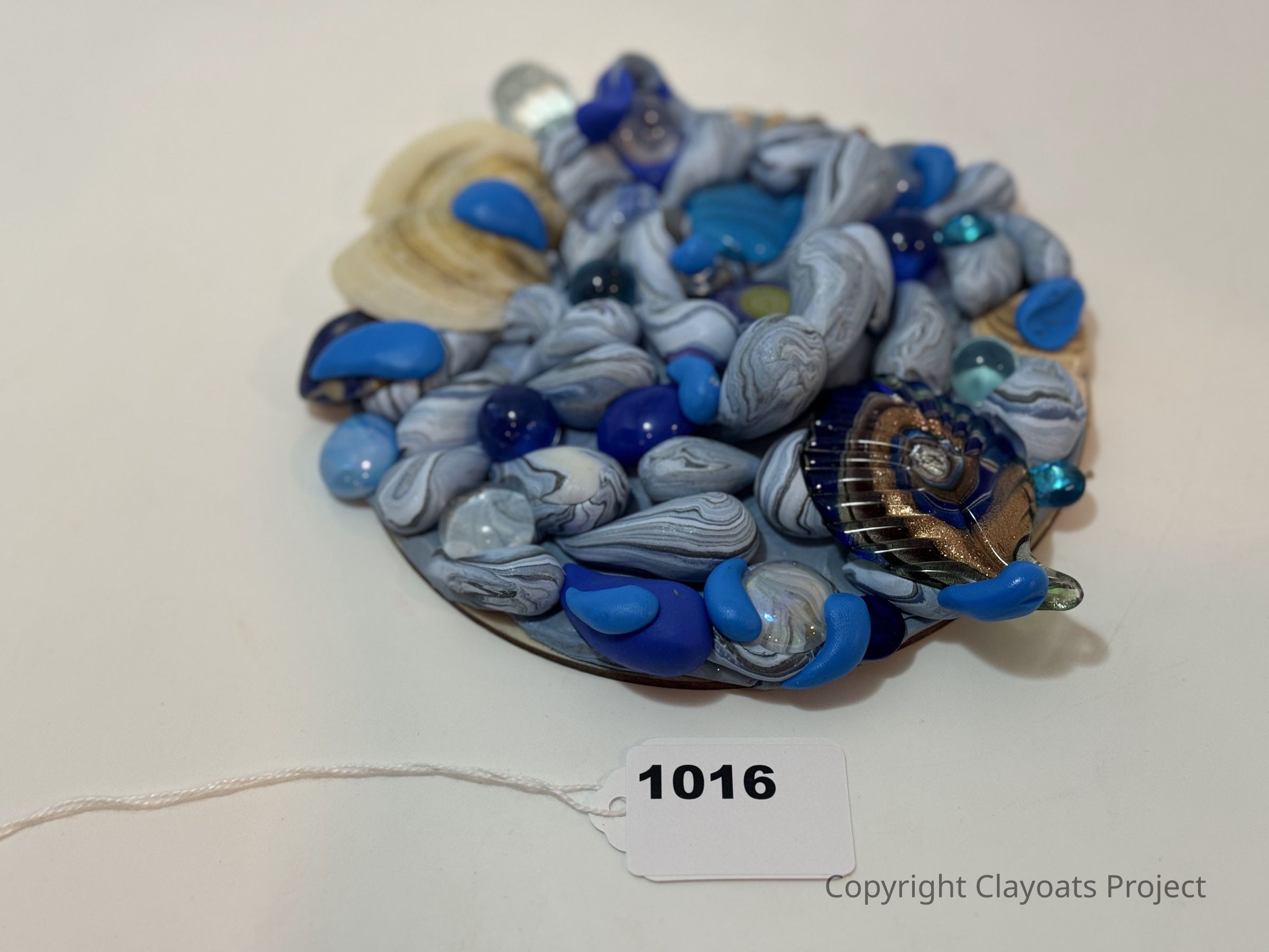 The image displays a circular decorative arrangement made from a variety of small, smooth stones and glass pieces in shades of blue, gray, and cream, resembling oceanic elements. Some stones have swirling patterns, while others are solid-colored, and an intricate, metallic embellishment is incorporated into the design. Shades of vibrant blue contrast with muted grays and creams, creating a harmonious blend of colors.