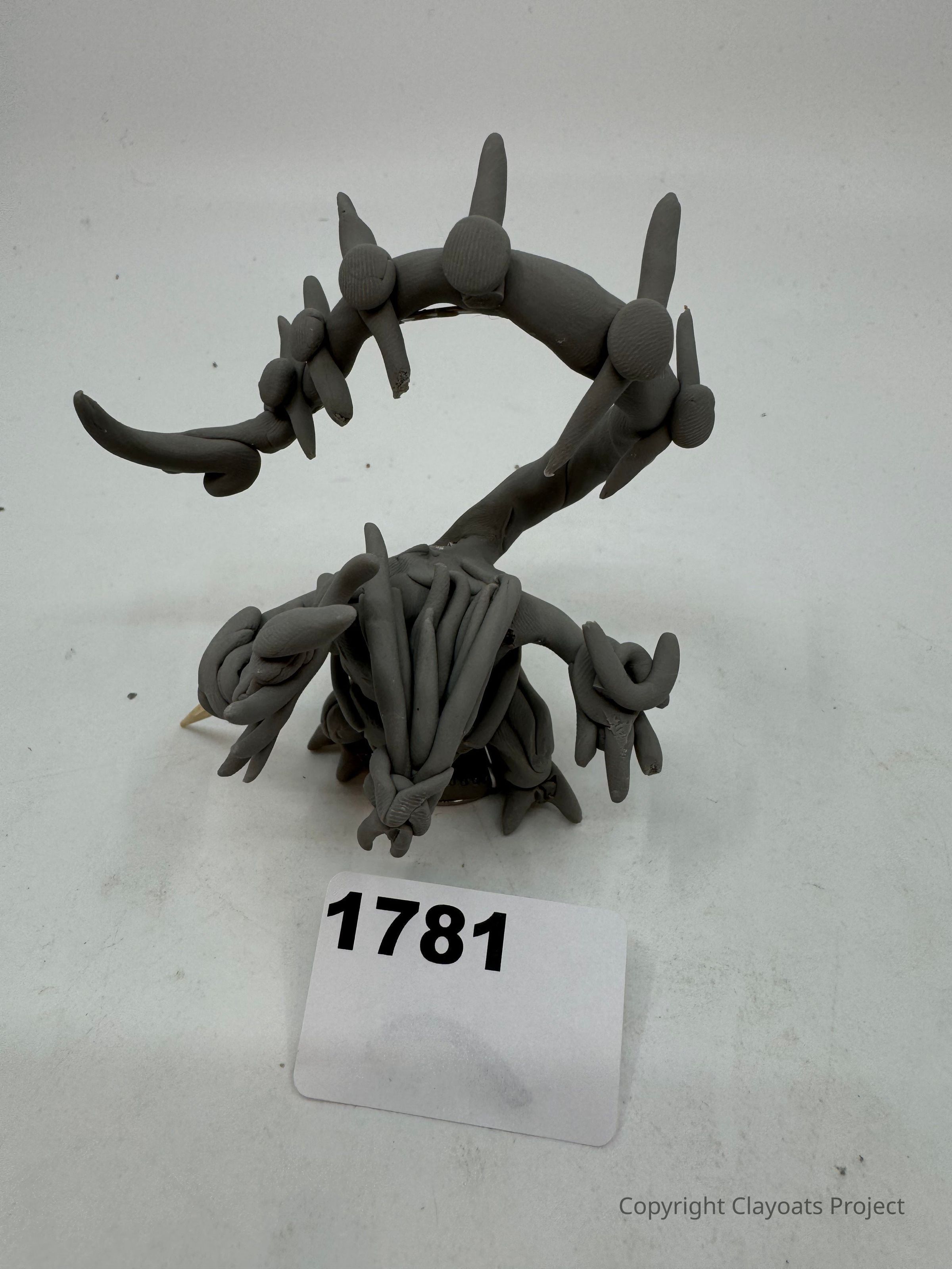 The image features a creatively sculpted figure made from gray clay, characterized by intricate, twisting forms and organic shapes, reminiscent of a fantasy creature or abstract art. The sculpture has an asymmetrical, dynamic design, with protruding elements and a serpentine structure that curls upwards. The background is a simple, neutral surface that contrasts with the