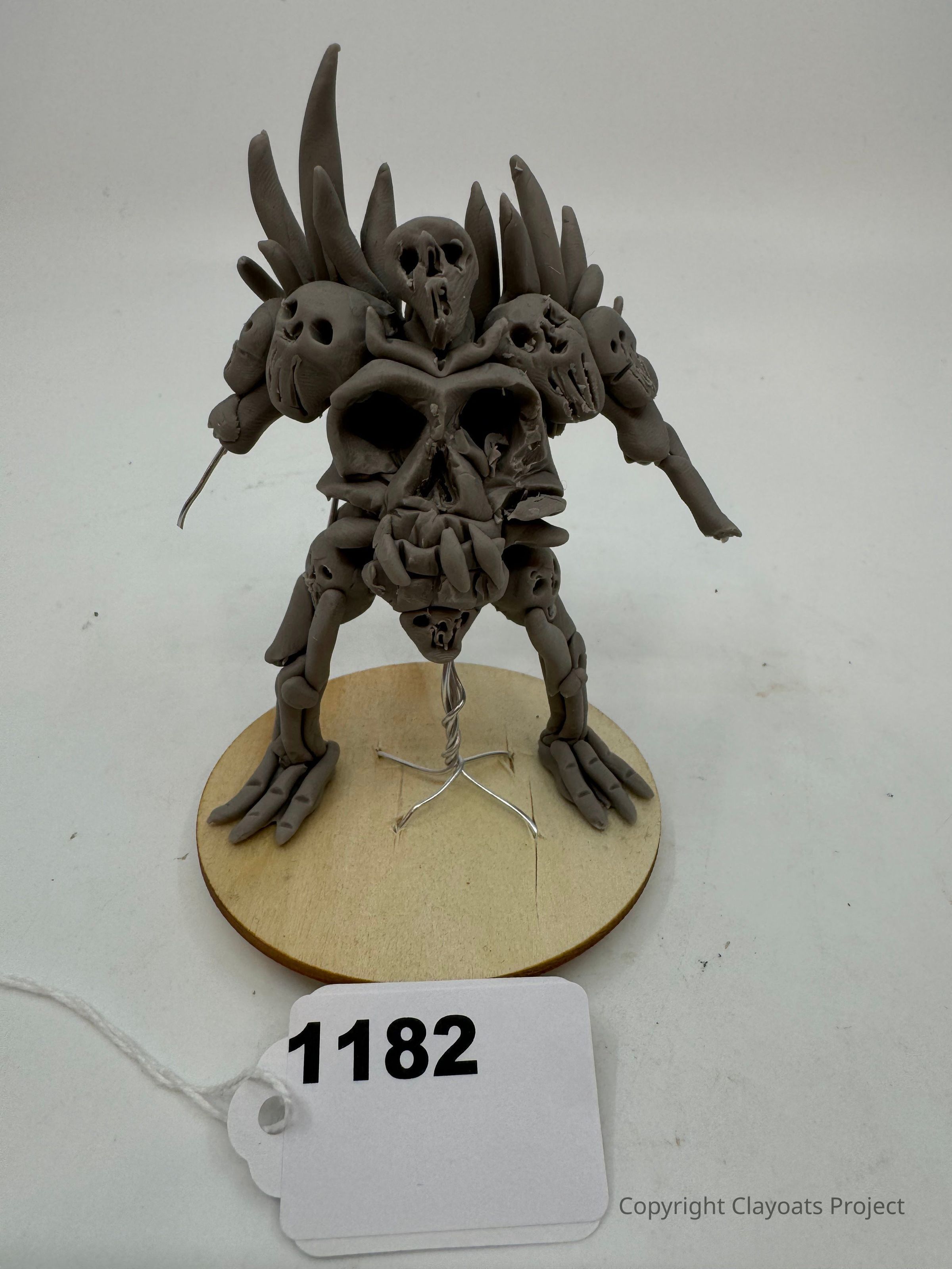 The image shows a unique sculpture on a wooden base, featuring a dark, skeletal figure made of clay or a similar material. The sculpture includes multiple skull-like elements and elongated spikes protruding from the head and shoulders. The figure stands with a menacing posture, The intricate detailing on the sculpture suggests a theme of horror or fantasy, with its expressive design conveying an eerie and artistic impression. The wireframe extending from the base supports the overall structure,