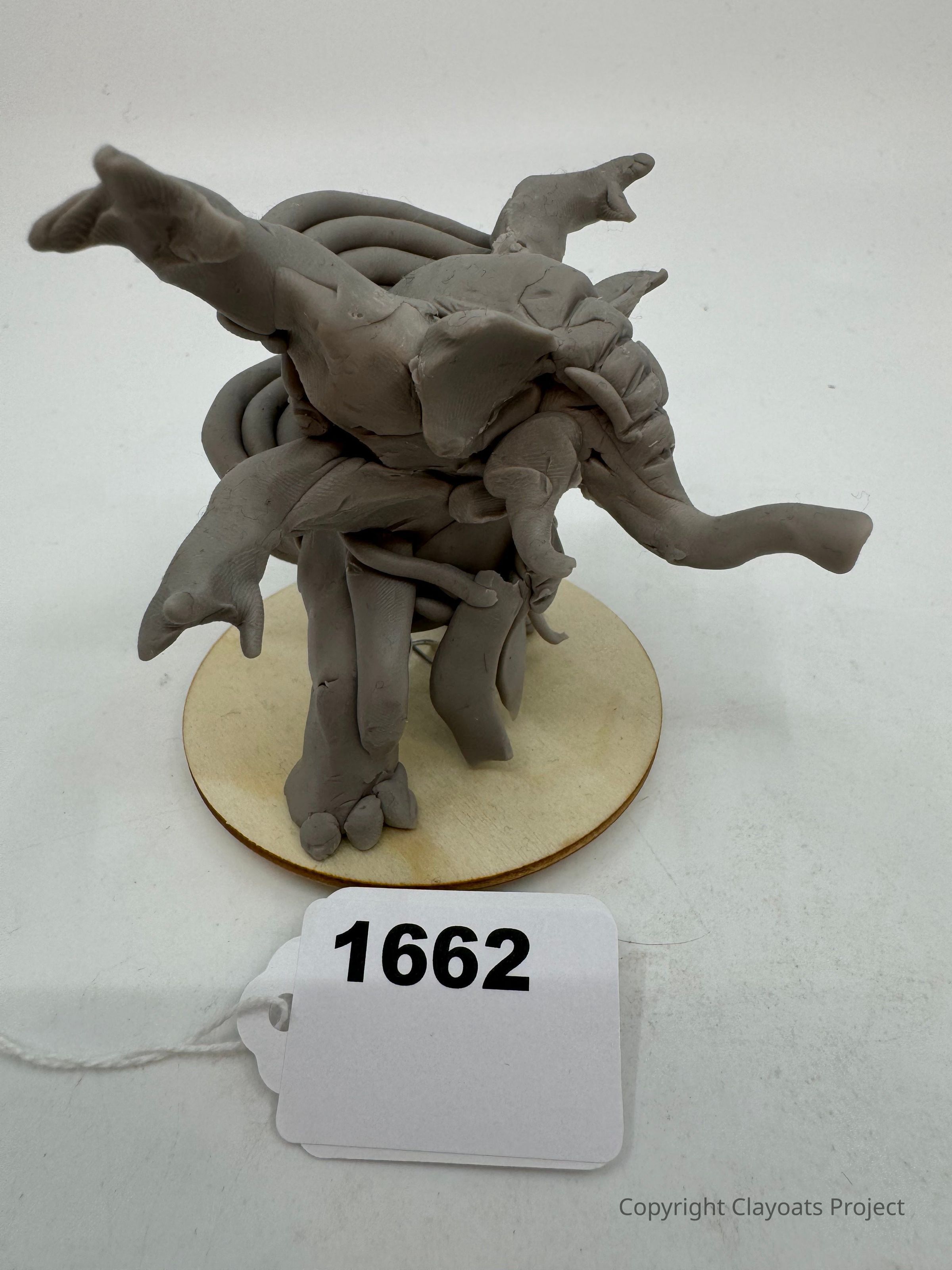 The image shows a clay sculpture featuring a fantastical creature with multiple limbs and an intricate design, standing on a circular wooden base; in front of the sculpture.