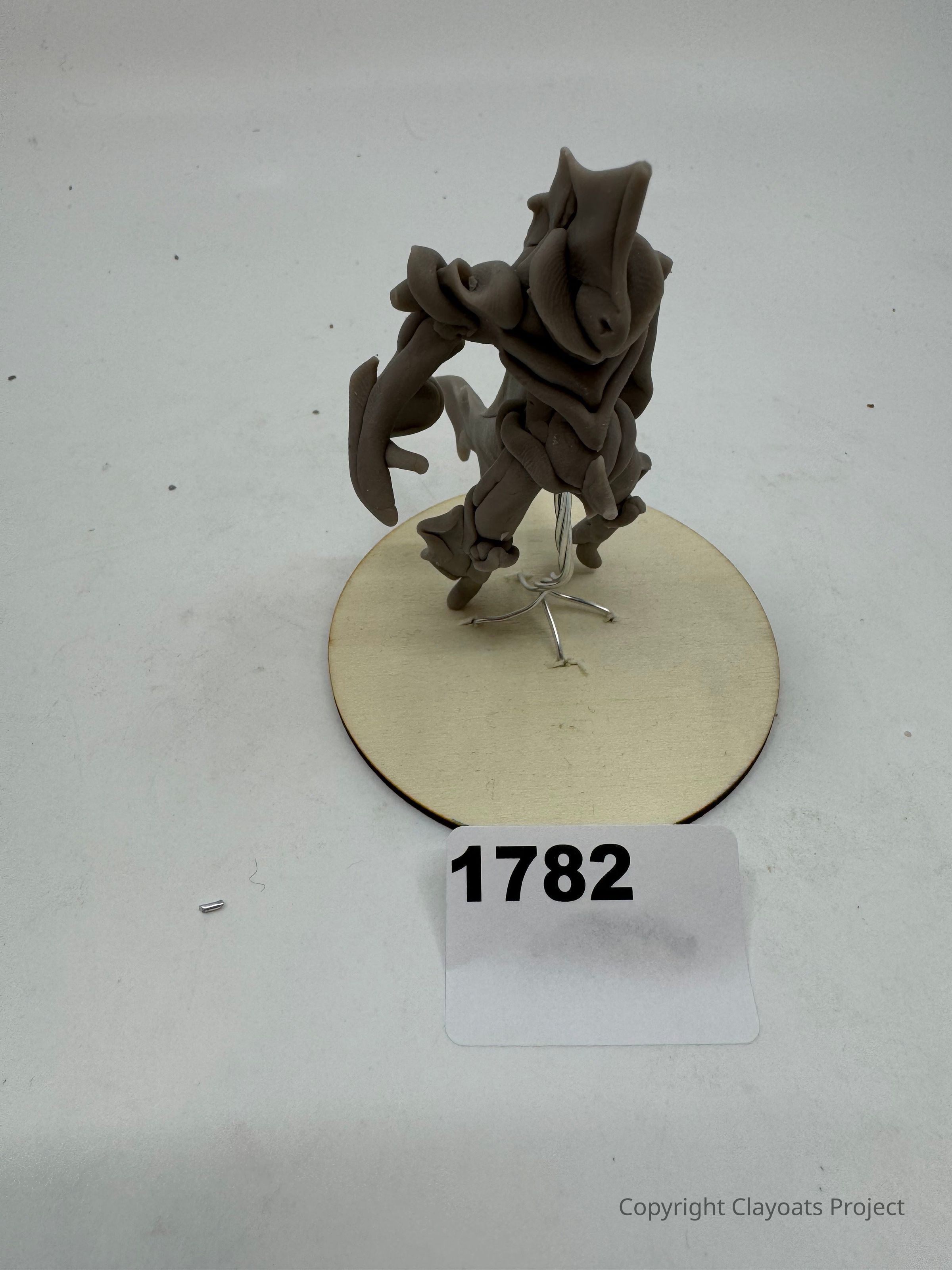 The image shows a clay sculpture resembling a humanoid or robotic figure with intricate, abstract features mounted on a circular wooden base. It is placed on a white surface. The figure appears to be supported by a thin wire structure, allowing it to stand upright. The background is plain and of a neutral color, emphasizing the details of the sculpture. This artwork exhibits a creative combination of textures, suggesting a fusion of organic and