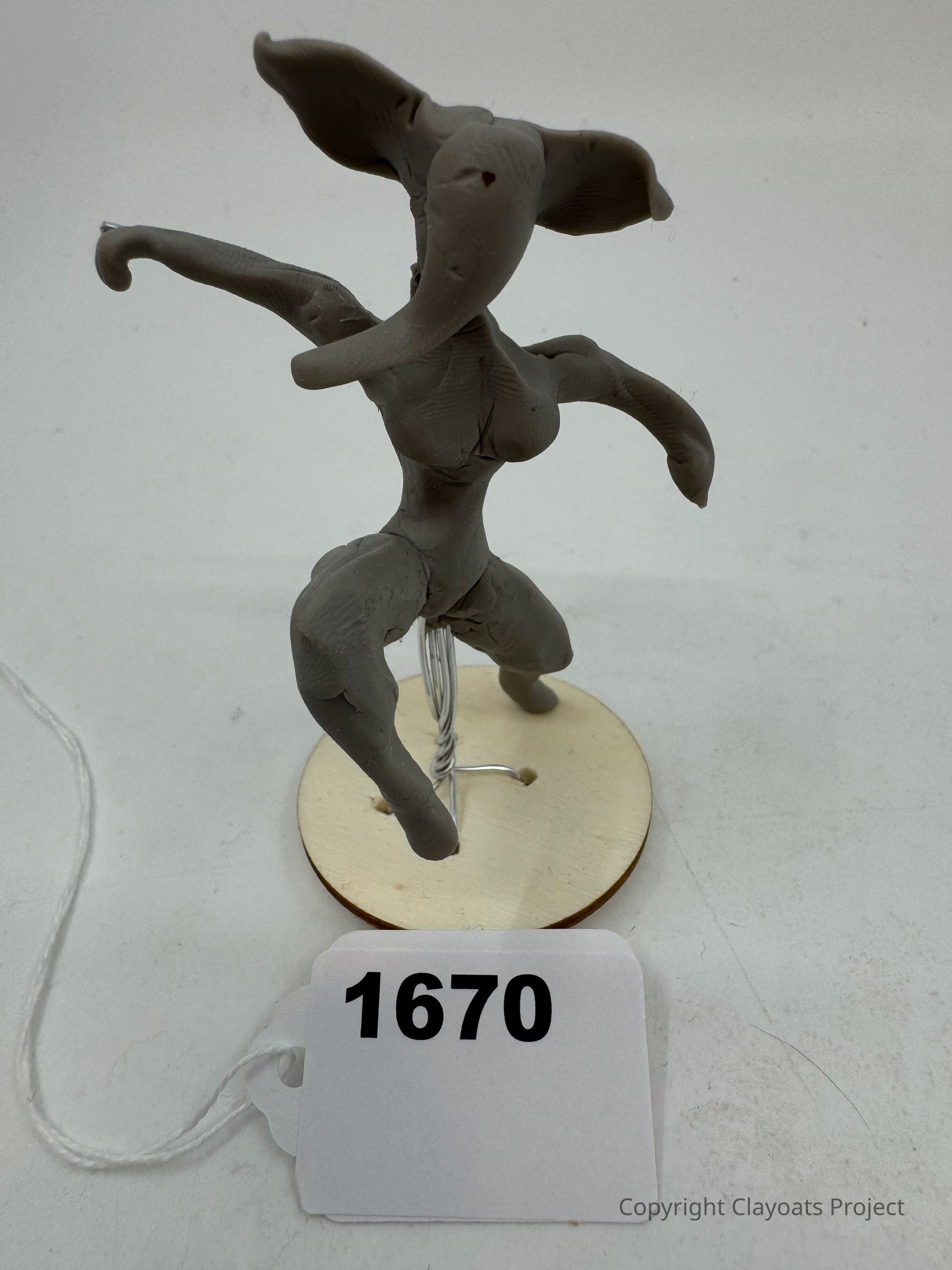 The image features a small clay sculpture with an abstract humanoid form, characterized by elongated limbs and large, ear-like structures on its head, standing on a circular base with a metal wire for support, placed on a white surfaceThe sculpture's appearance suggests a dynamic pose, as though caught in motion.