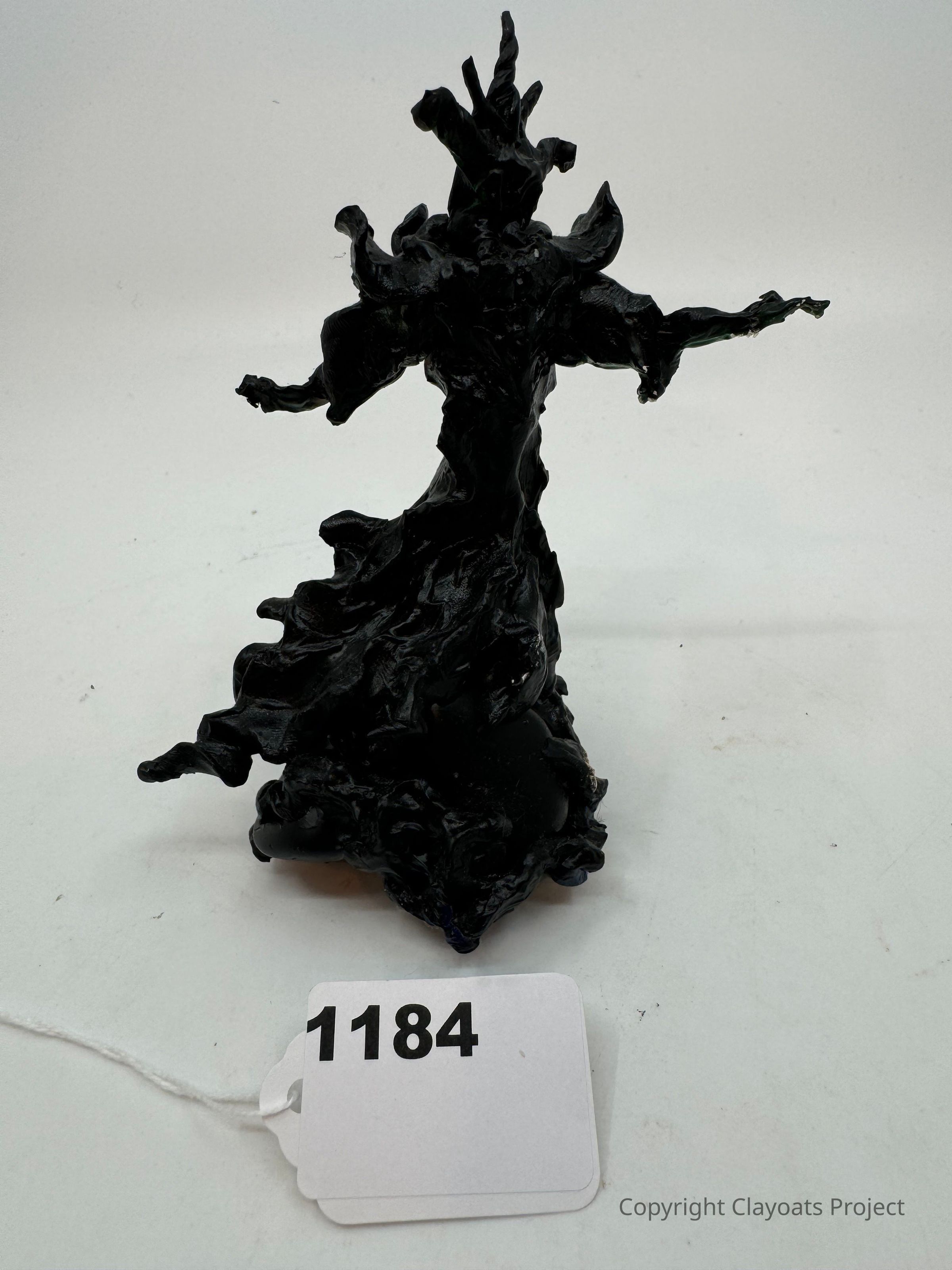 The image features a dark, intricately designed sculpture resembling a mysterious, flowing figure with outstretched arms, presenting an enigmatic and almost fantastical appearance against a plain background; in front of the sculpture.
