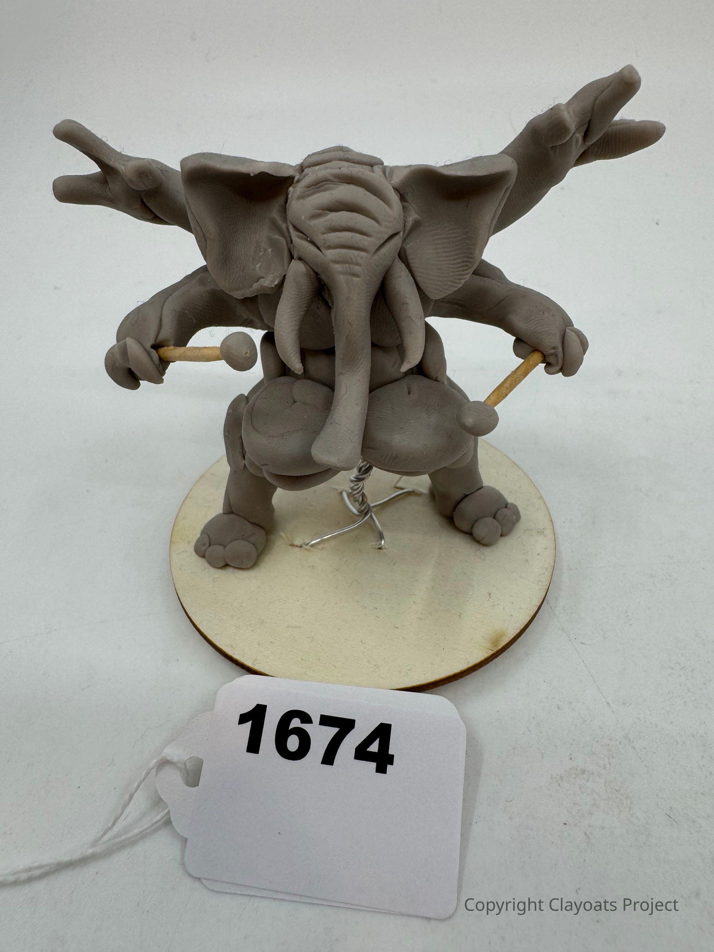 This image depicts a clay sculpture of an elephant playing drums, characterized by its detailed trunk, large ears, and multiple arms, each holding a drumstick. The sculpture is mounted on a round base with a small wire for support, The background is plain, highlighting the creativity and craftsmanship of the sculpture, which combines animal features with human-like attributes, possibly symbolizing rhythm and culture.