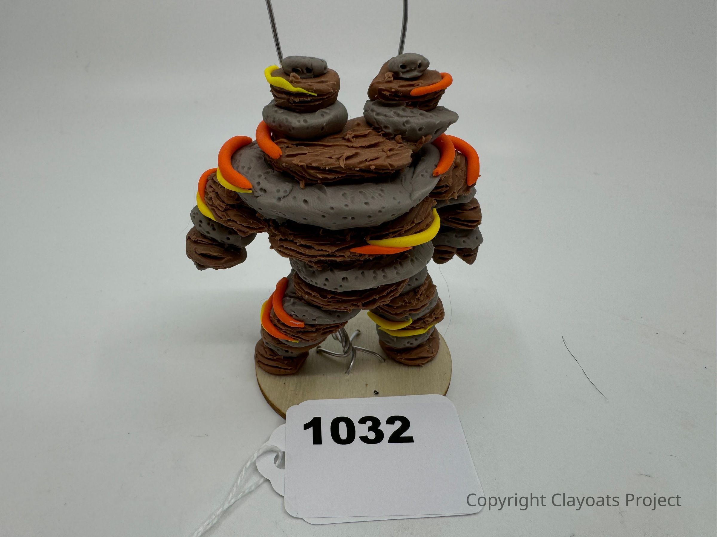 The image shows a clay sculpture of a humanoid figure with a textured surface resembling rock layers. Wrapped around its limbs and torso are bright orange and yellow rings, adding contrast to the clay’s earthy tones. The figure stands on a small wooden base, and a wire extends from its head, possibly for support or display purposes. In front of the sculpture.