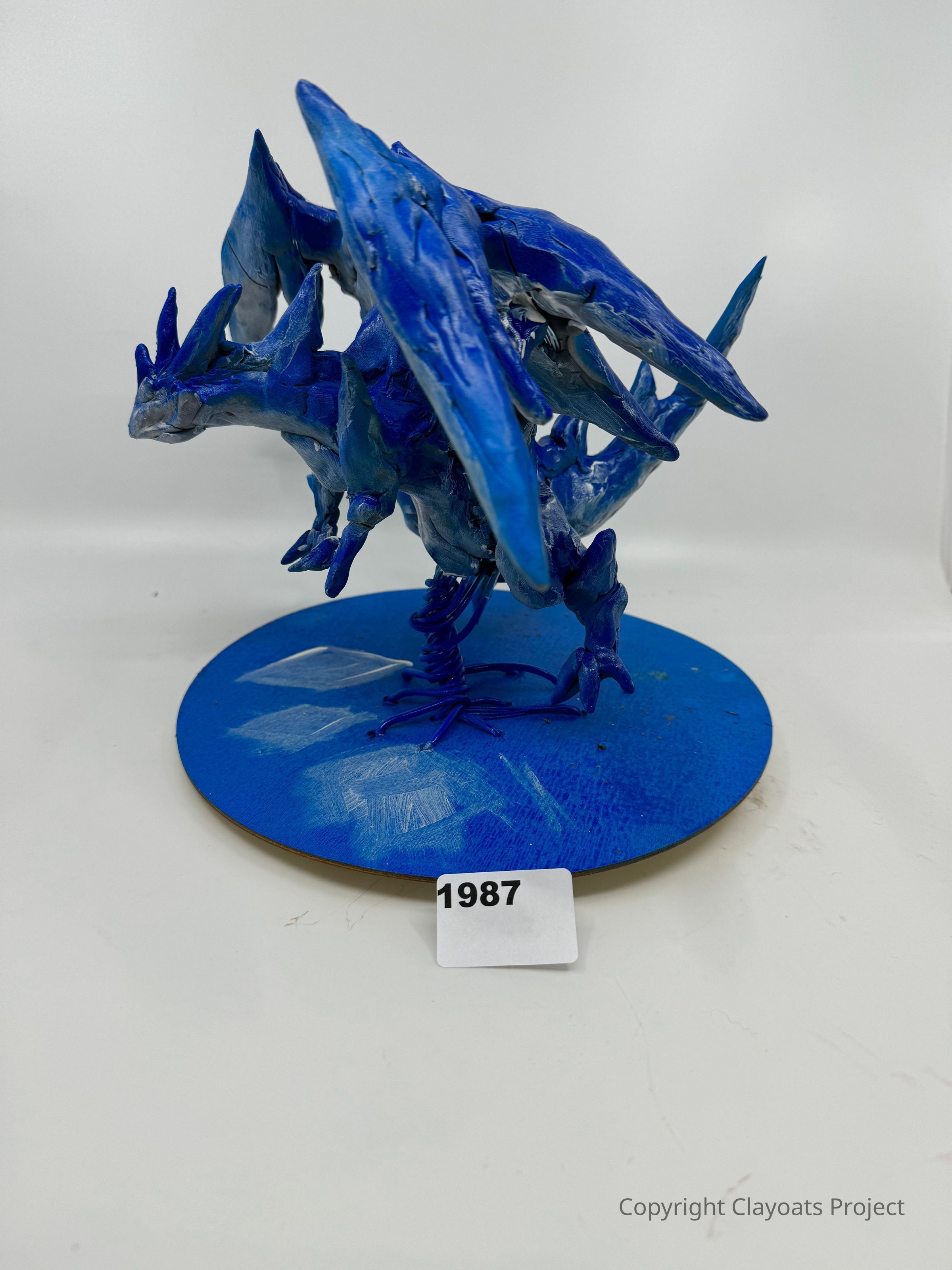 The image displays a blue dragon sculpture with intricately detailed wings, perched on a circular base painted in the same vibrant blue shade. Its fierce expression, prominently featured on the dragon's face, is complemented by the sharp, angular edges of its wings and body, creating an impression of movement and power. The dragon, a creature of myth and legend, is expertly crafted, showcasing a blend of artistic creativity and craftsmanship. The sculpture rests on a plain background, drawing attention solely to the dragon.