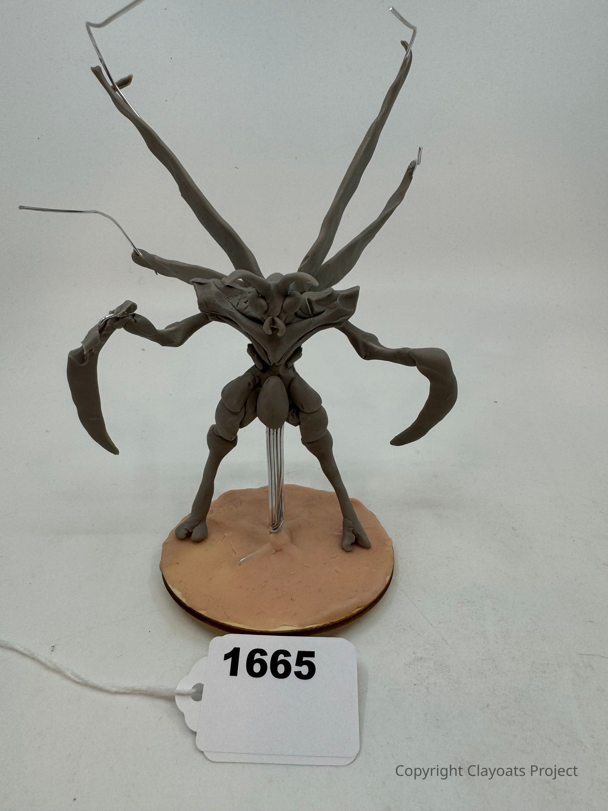 The image shows a sculpture of a fantastical creature with six elongated, spiky appendages and a humanoid form, standing on a circular base. The creature has a detailed, insect-like face with sharp features, and its clawed feet secure it to the base with visible thin wires. The entire figure, which appears meticulously crafted from a clay or similar material, stands in a dynamic posture that suggests motion or readiness to move.