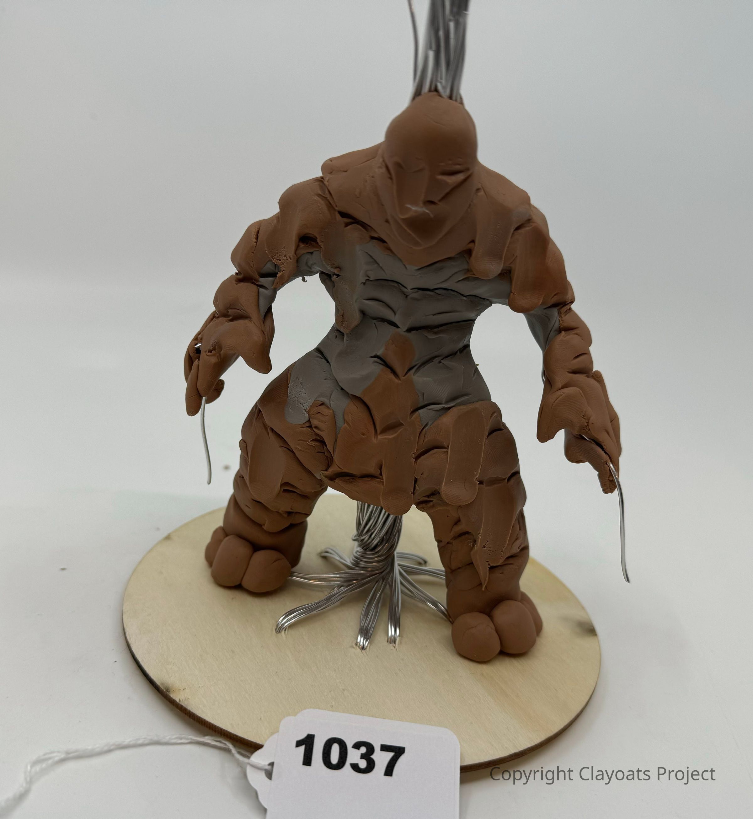 The image depicts a clay sculpture of a humanoid figure, primarily brown with some gray detailing, standing on a round wooden base. The figure appears to be constructed of wire covered with clay, featuring a textured surface giving it a rugged appearance. Its stance is slightly crouched, with both arms bent at the elbows, while thin wire strands extend from its fingers, suggesting possible claws or talons. The base consists of intertwined wire strands for stability.