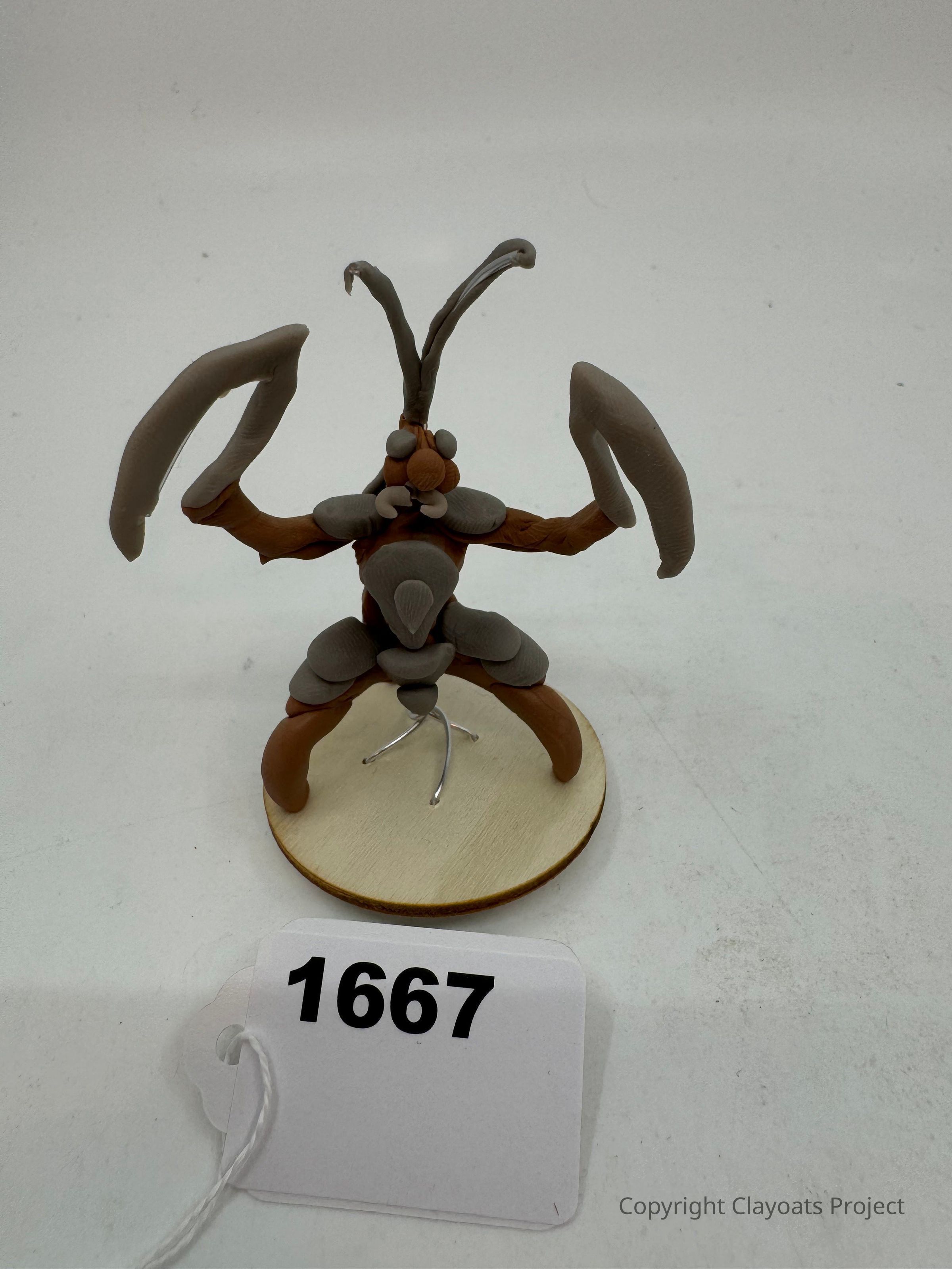 The image depicts a clay sculpture of a fantastical creature with long, curved antennae and large claw-like arms, standing on a round wooden base.