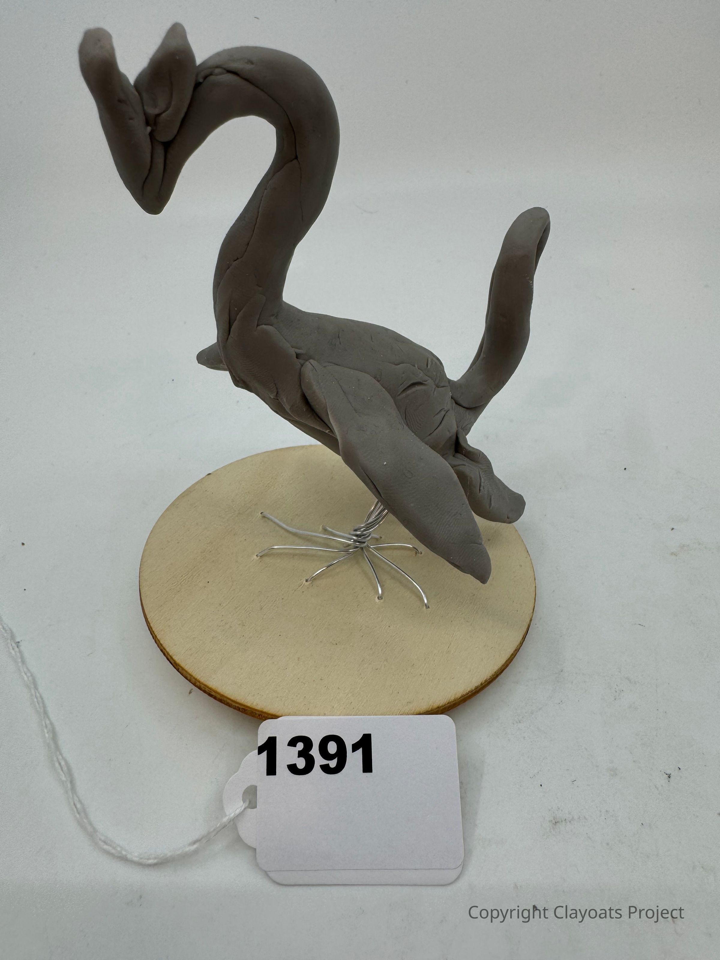 The image shows a handmade clay sculpture resembling an abstract bird, positioned on a circular wooden base with wire feet.. The sculpture has a smooth, flowing design with an elongated neck and a coiled tail. The clay's texture appears soft, adding to the artistic, fluid aesthetic of the piece, which casts a subtle shadow on the white backdrop. The overall composition suggests a sense of creative experimentation and imaginative form, highlighting the sculptor's skill in manipulating materials.