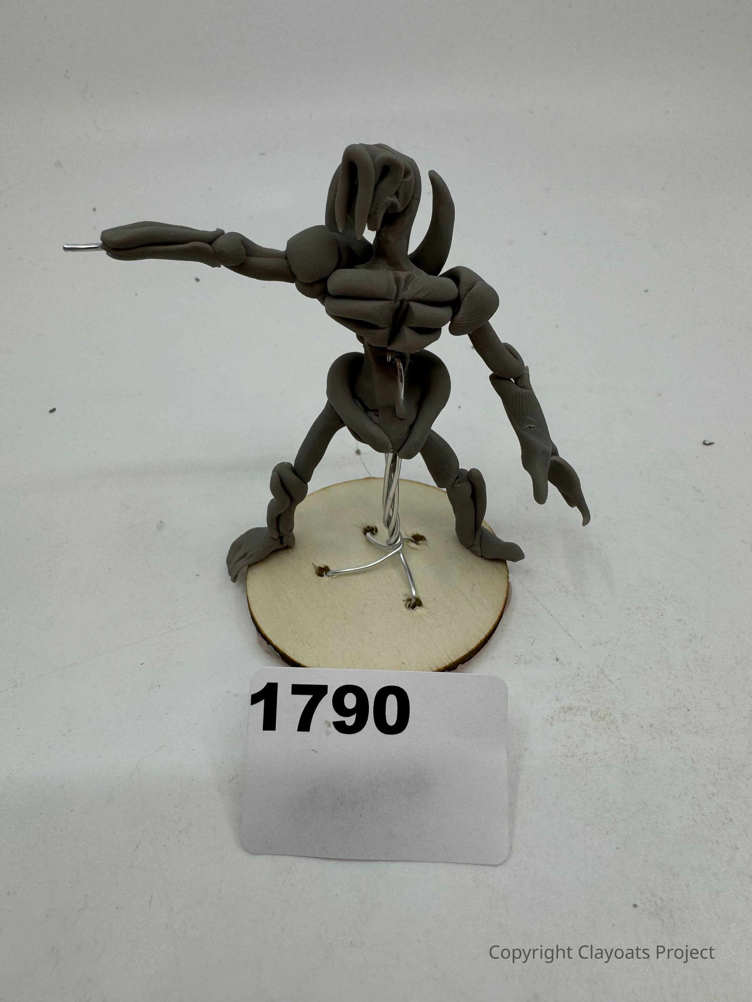 The image shows a clay sculpture of a humanoid figure in a dynamic pose with one arm outstretched, standing on a circular wooden base supported by a wire structure. The sculpture is made from a dark gray clay with distinct, exaggerated features that include elongated limbs and segmented sections, giving it an abstract, artistic appearance. The background is a plain white surface, enhancing the focus on the unique design of the figure and its intricate details.