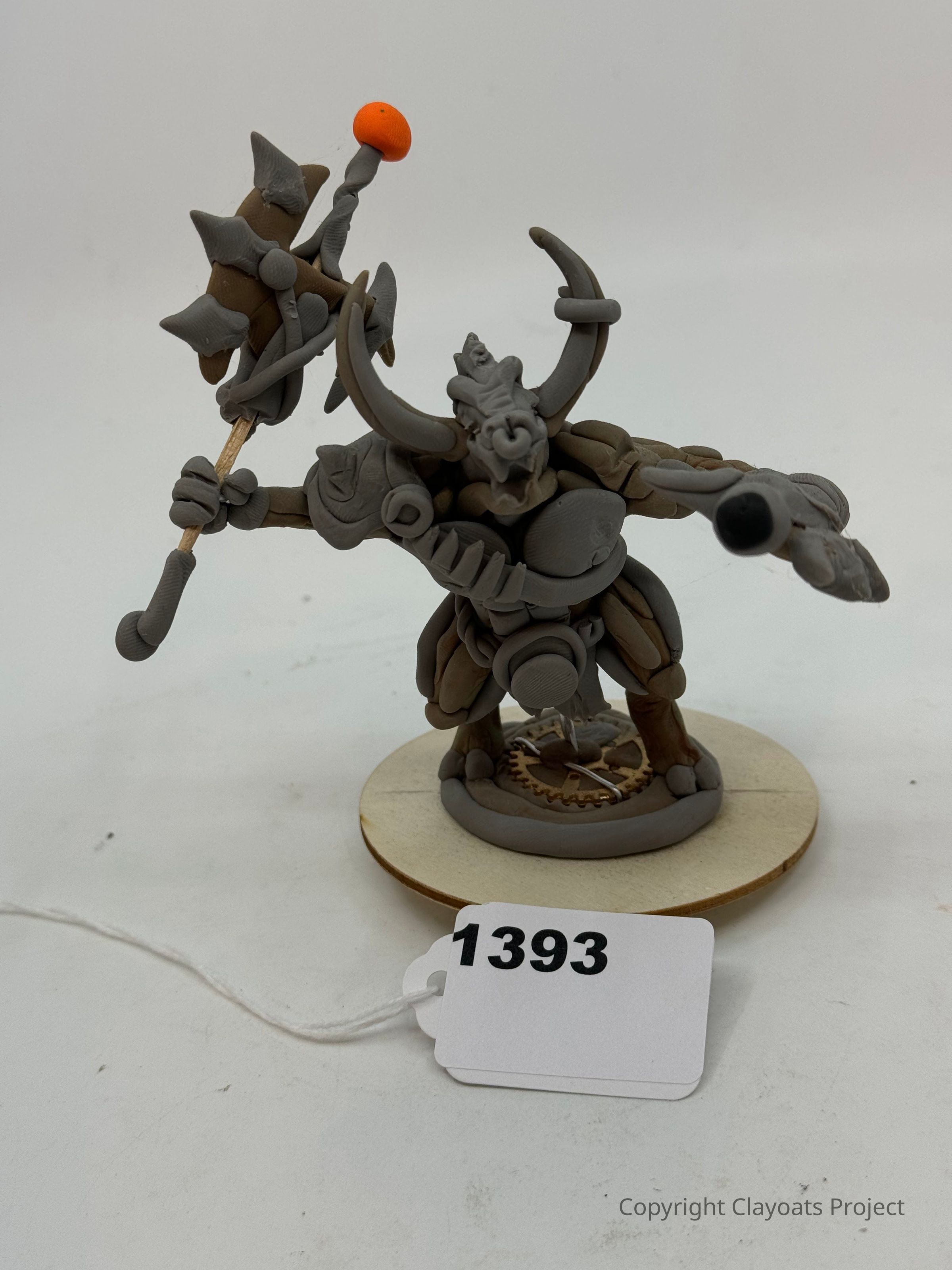 A gray, intricately detailed clay figurine stands on a round base, holding a staff with a spiked design and an orange tip. The figure features horn-like structures on its head, adding to its mythical appearance. It has a dynamic pose with one arm extended forward, and a unique, gear-like pattern is visible on the base.