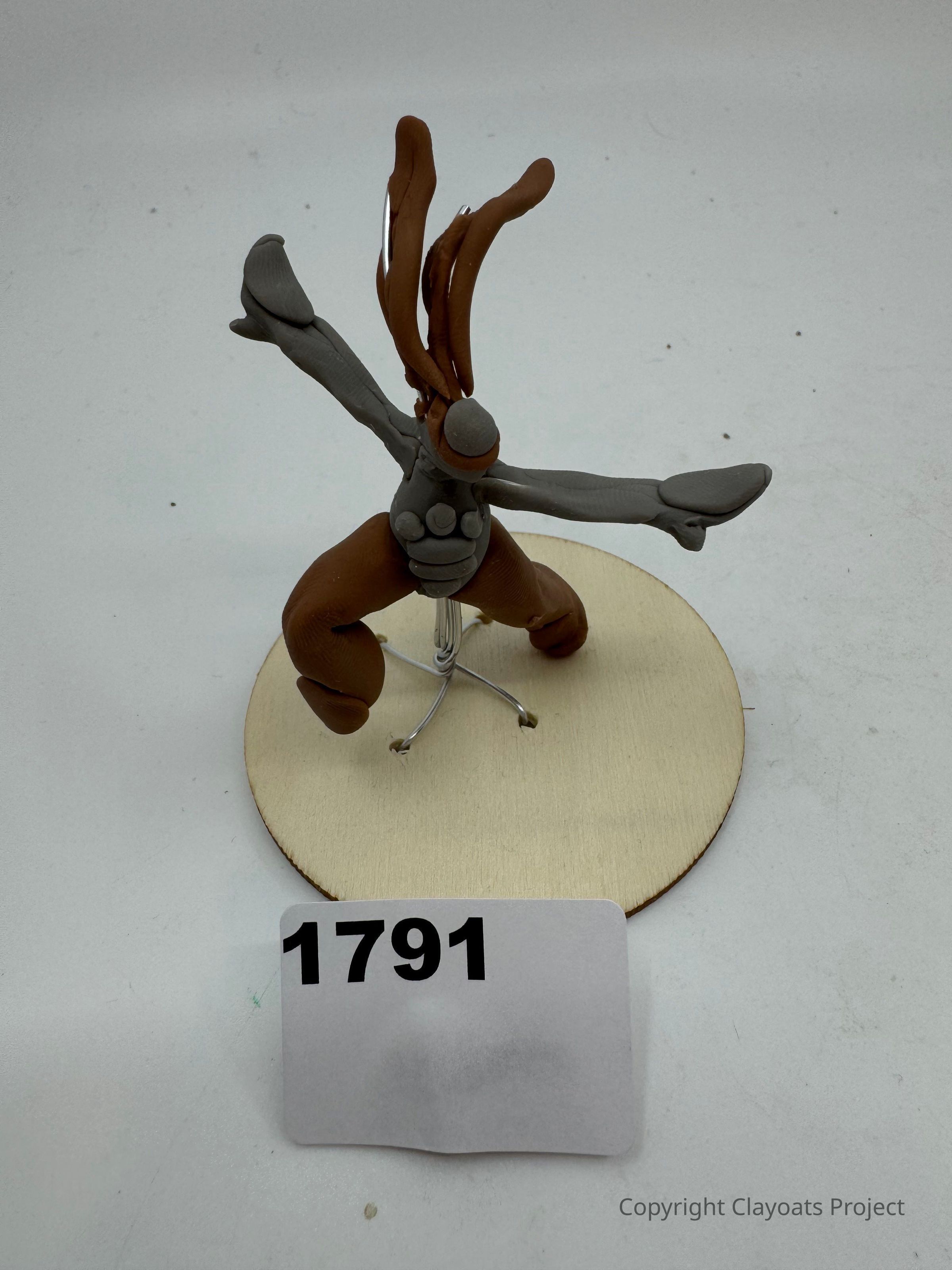 The image shows a clay sculpture of an abstract humanoid figure with a combination of gray and brown colors, featuring elongated arms and hair-like extensions. It is mounted on a round wooden base. The ground beneath it appears smooth and white. The sculpture possesses a dynamic pose, suggesting movement or dance, with limbs extended and sweeping motion. Its overall appearance is artistic and imaginative, demonstrating a creative use of form and color