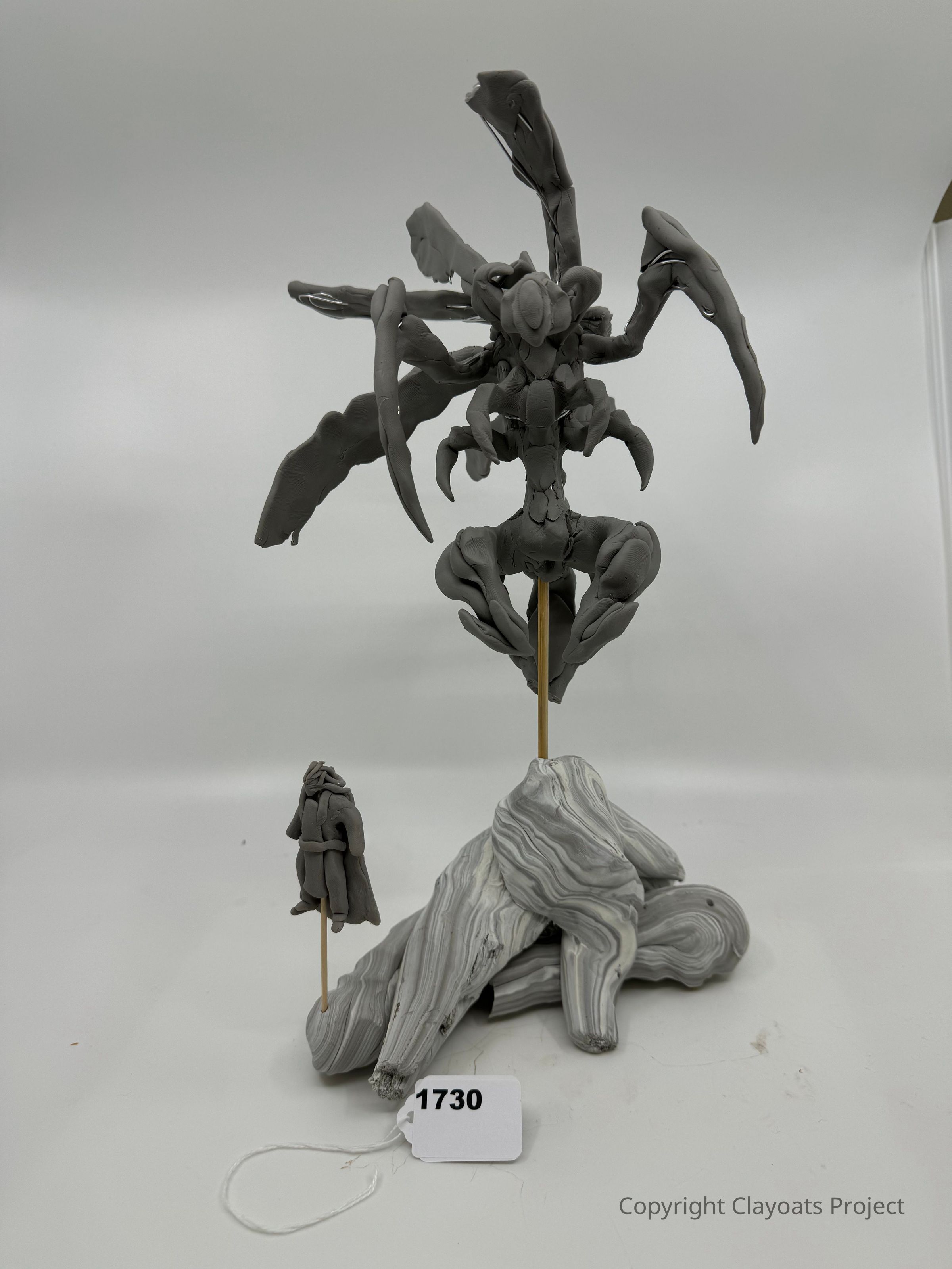 The image depicts a detailed sculpture featuring a large, intricate creature with multiple limbs and a humanoid figure in a cloak, both crafted from a gray clay material. The creature, positioned higher on a stand, shows an aggressive posture with extended appendages, while the smaller figure stands below, seemingly observing or interacting with the formidable form above. Both figures are set on a textured, rocky base that adds an organic, natural element to the display.