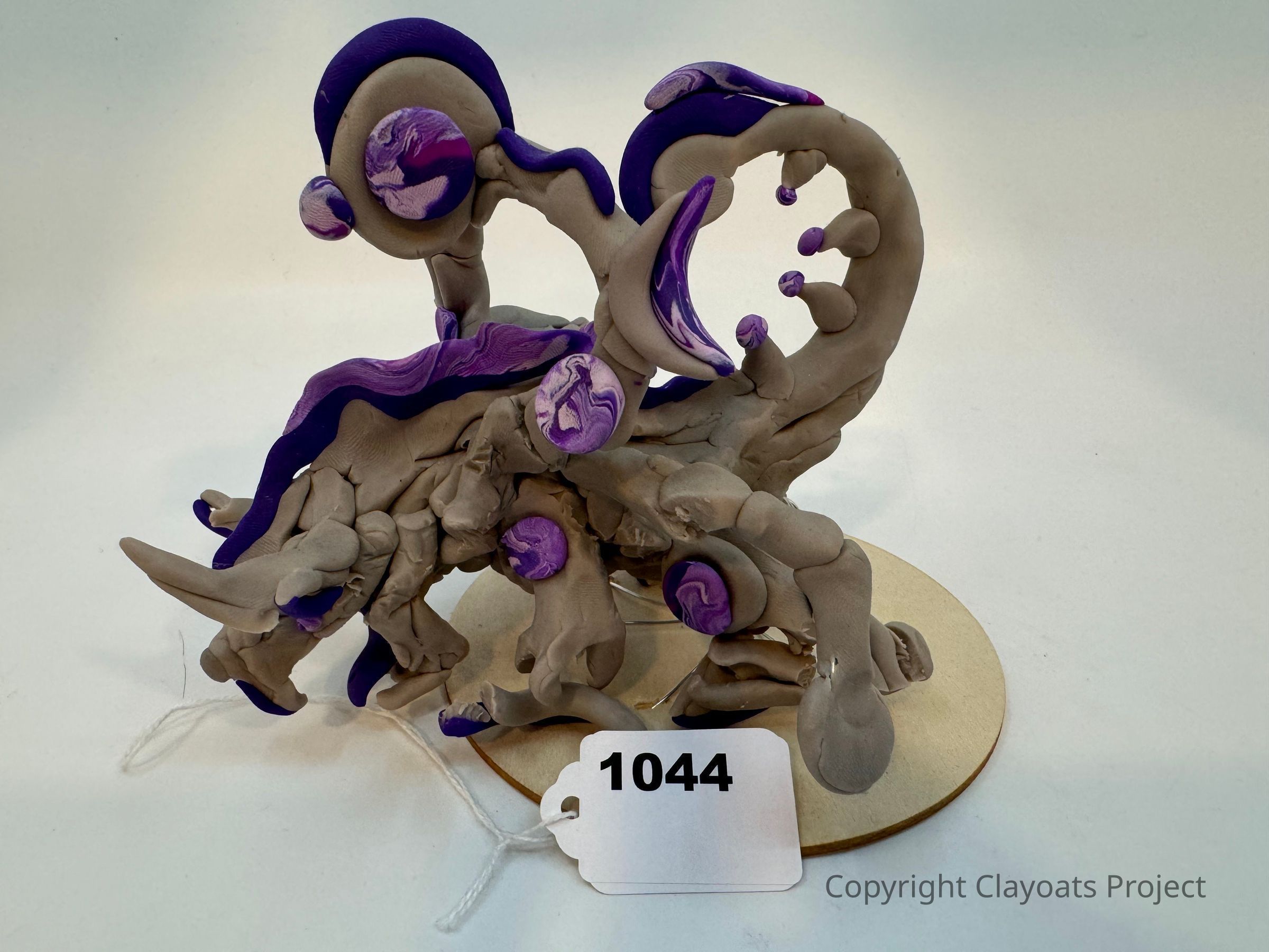 The image shows a complex sculpture composed of clay-like materials, featuring abstract shapes and swirling patterns in shades of gray and vibrant purple. The sculpture includes various spherical and ring-like structures that exhibit a mixture of textures and colors, creating a dynamic visual effect on a neutral base. The piece appears imaginative and whimsical, evoking thoughts of fantastical creatures or otherworldly landscapes,