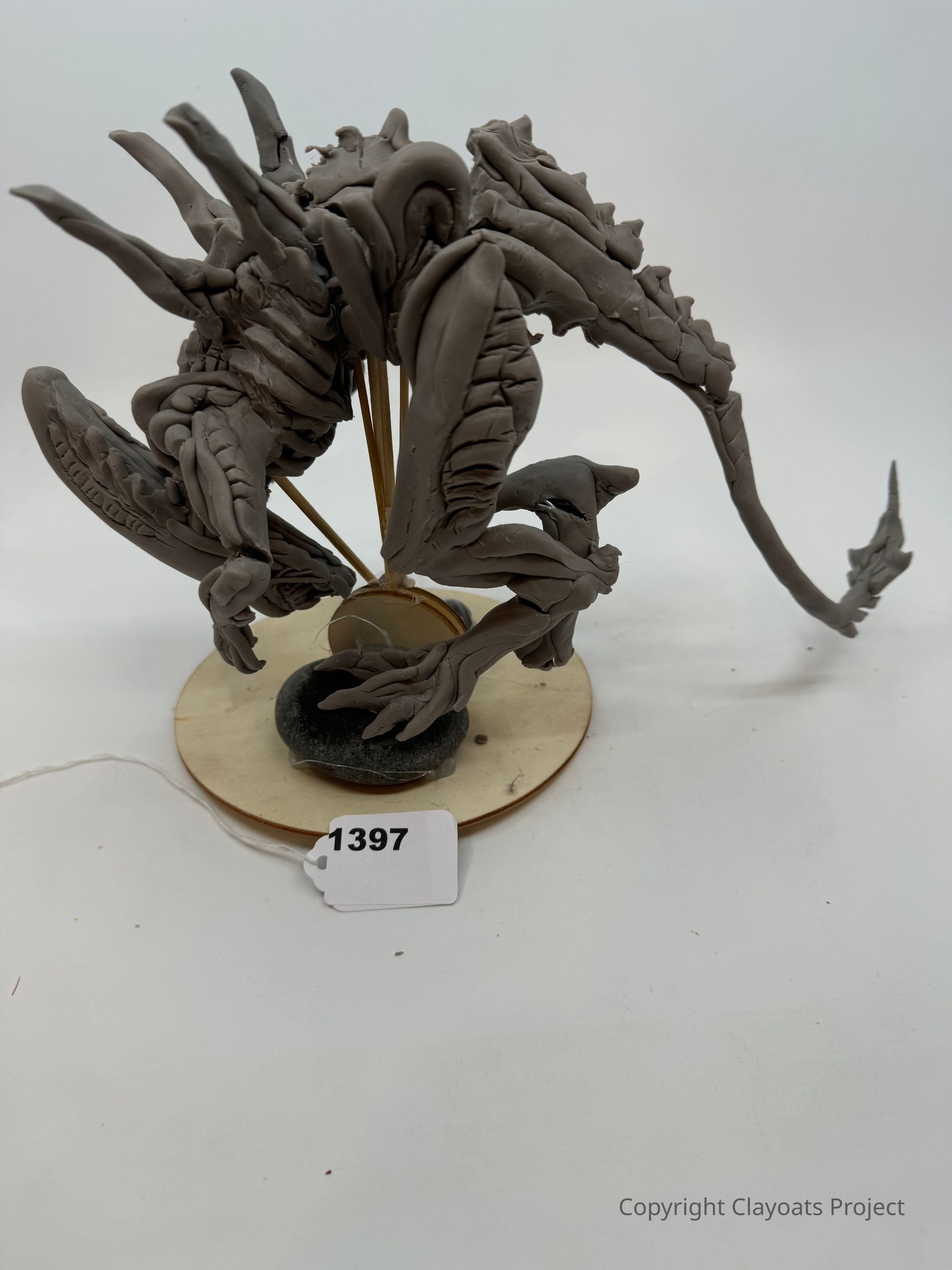 The image showcases a detailed clay sculpture of a fantastical creature, featuring multiple elongated appendages and intricate textures, mounted on a circular wooden base with a rock for support, the creature’s design appears complex and imaginative, presenting an organic and alien-like aesthetic, enhanced by the sculpture's dynamic posture and emphasis on anatomical features that evoke both insect-like and mythological monster elements, contributing to an atmosphere of creativity and craftsmanship evident in the meticulous attention to