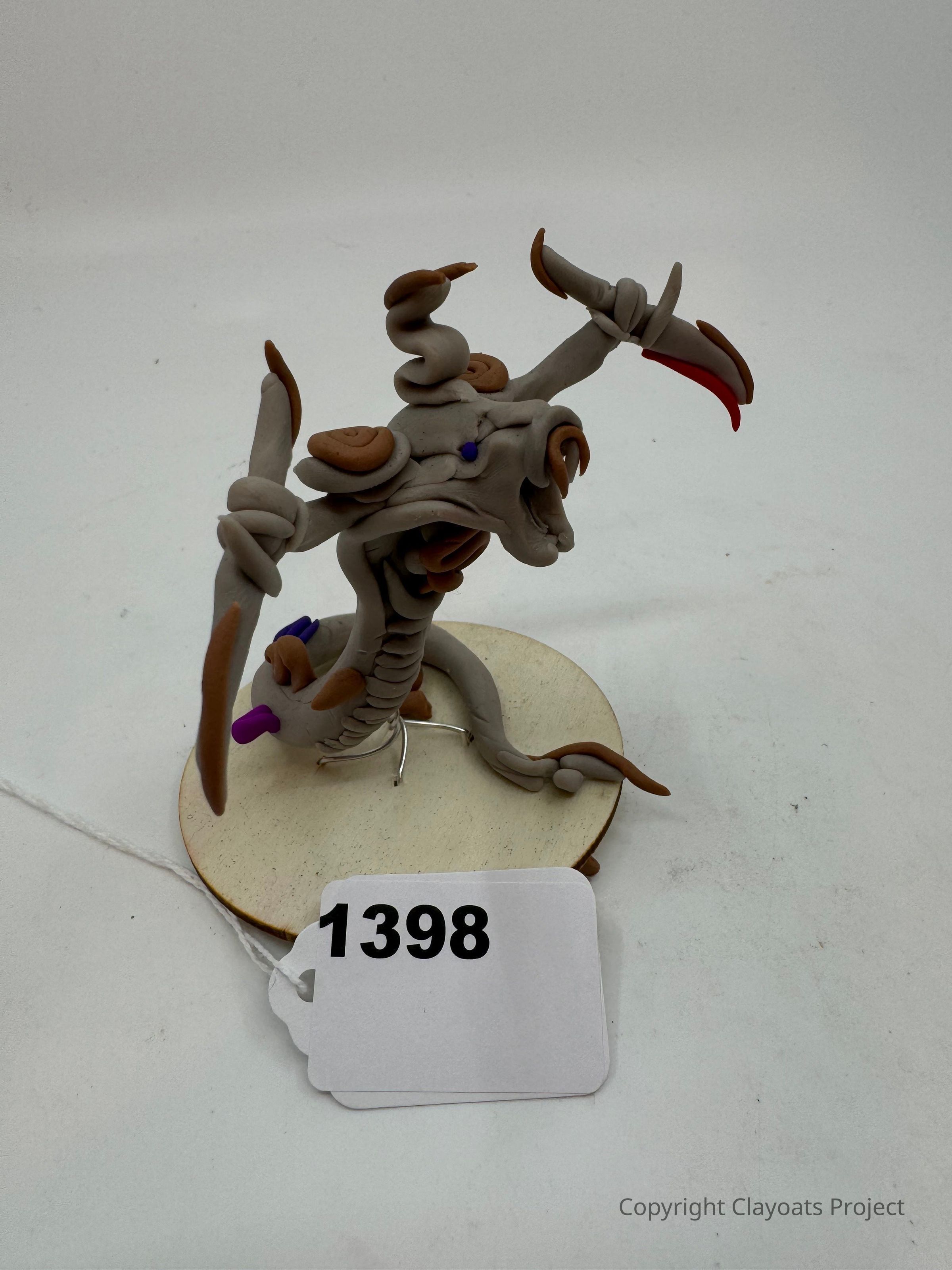 The image depicts a creatively crafted sculpture made from clay, featuring a fantastical creature with swirling limbs and horn-like extensions, set on a round wooden base. Its design includes intricate details and a mix of colors—primarily earthy tones with accents of red and purple. The creature appears to have an animated expression and dynamic posture, as if in motion.