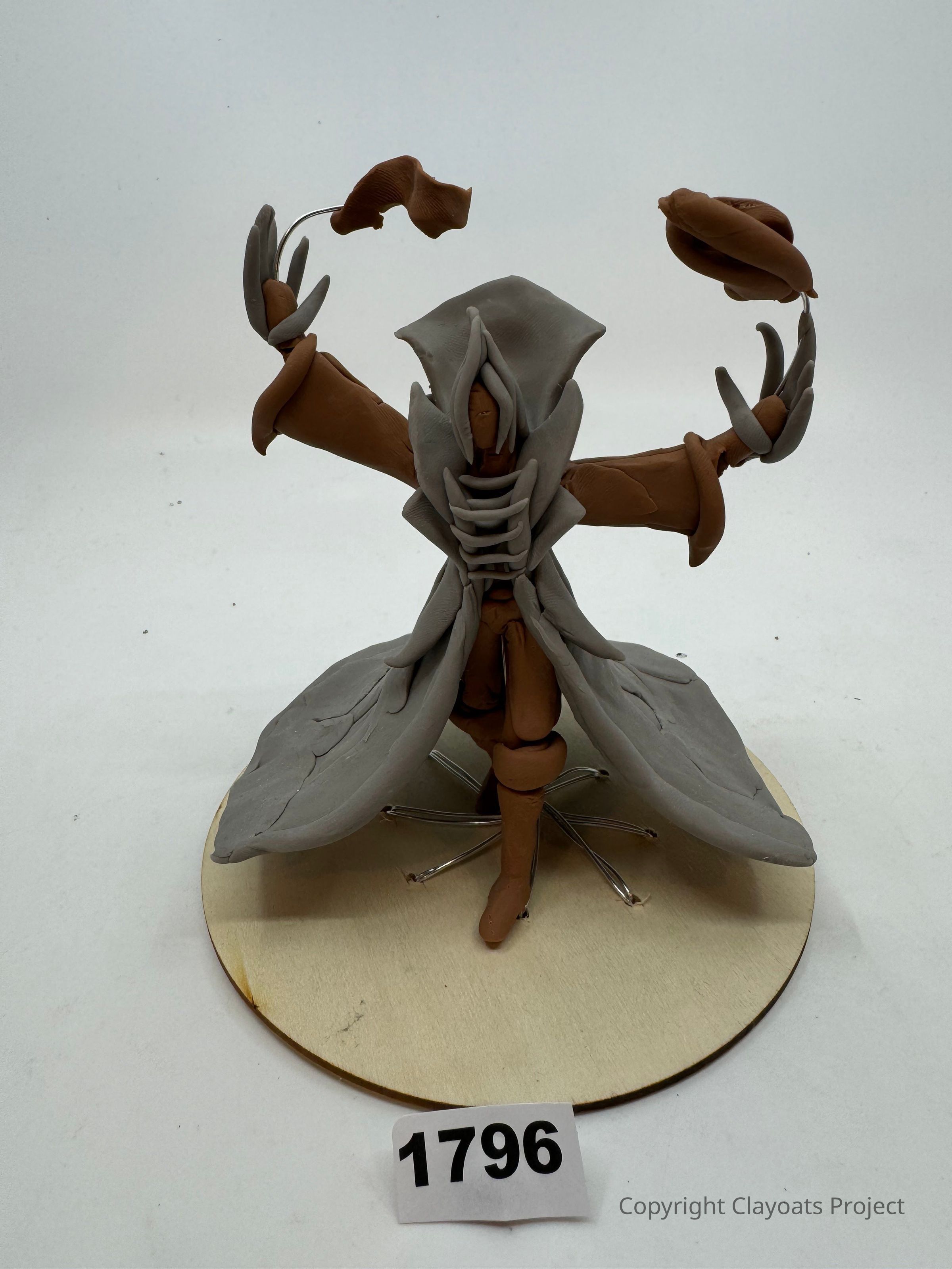 The image features a clay sculpture of a humanoid figure with outstretched arms, adorned in a flowing cloak and hood, creating an impression of dynamic motion. The figure appears to be casting objects or energy from its hands, giving an ethereal and mysterious aura to its presence. Resting on a circular wooden base, the figure is delicately balanced on wire supports, emphasizing both its stability and grace. The subdued earthy tones of the clay enhance the sculpture’s organic feel.