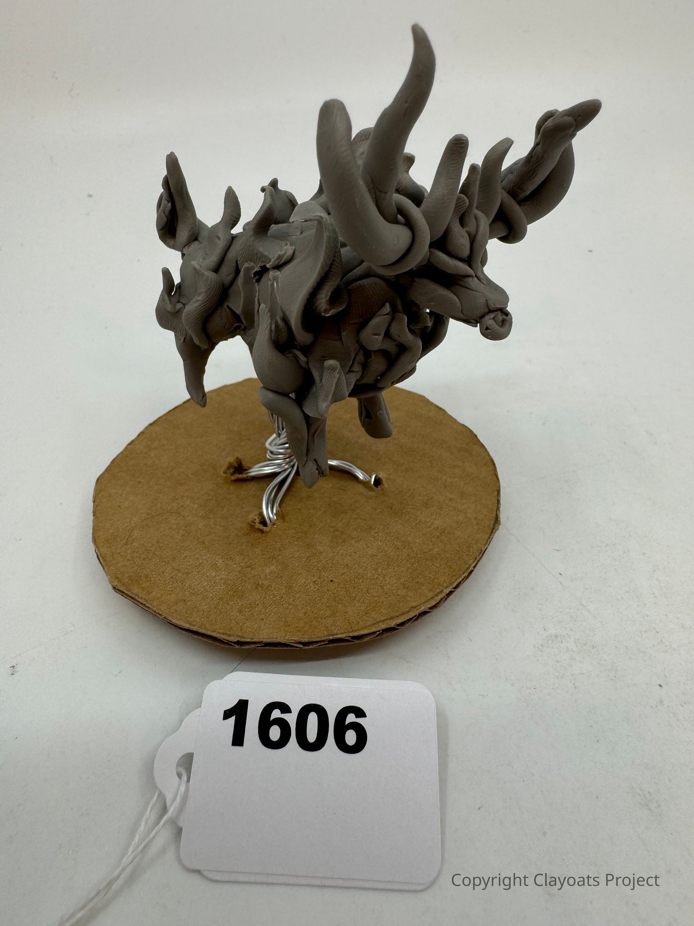 The image features a gray clay sculpture on a circular cardboard base, intricately shaped with flowing and twisting horn-like structures, resembling an abstract creature standing on a surface supported by a metallic wire framework, which evokes a sense of mystery and creativity through its unconventional and imaginative design, encouraging viewers to engage with its unique form.