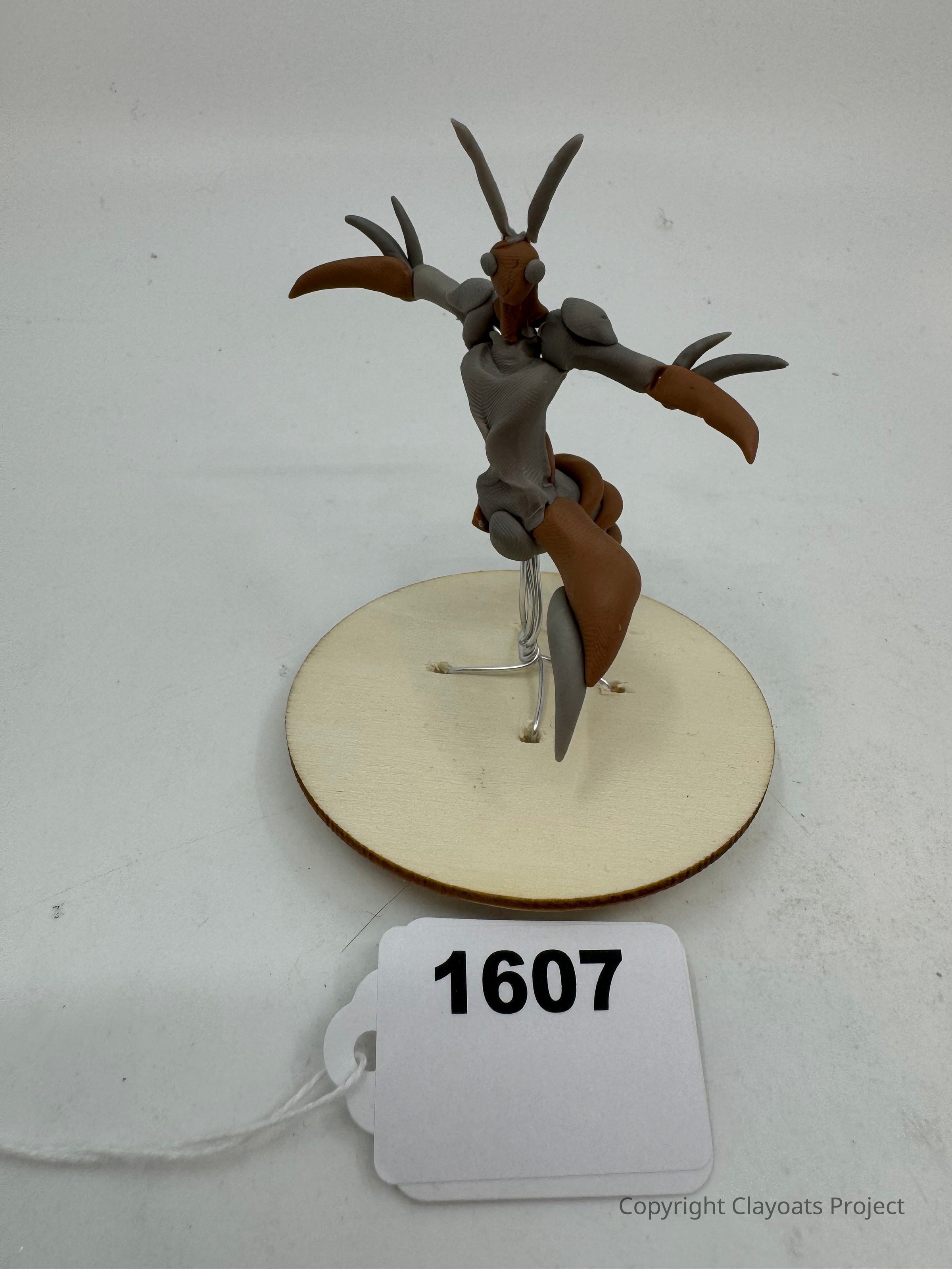 The image shows a small sculpture of a creature resembling an insect or mantis-like figure standing on a round wooden base. It has articulated limbs, with large claws or pincers extending outward. The sculpture is primarily composed of gray and brown materials, possibly clay or a similar medium, and features pronounced antennae on its head. The figure is affixed to the base using thin wires that support its pose. In the foreground.