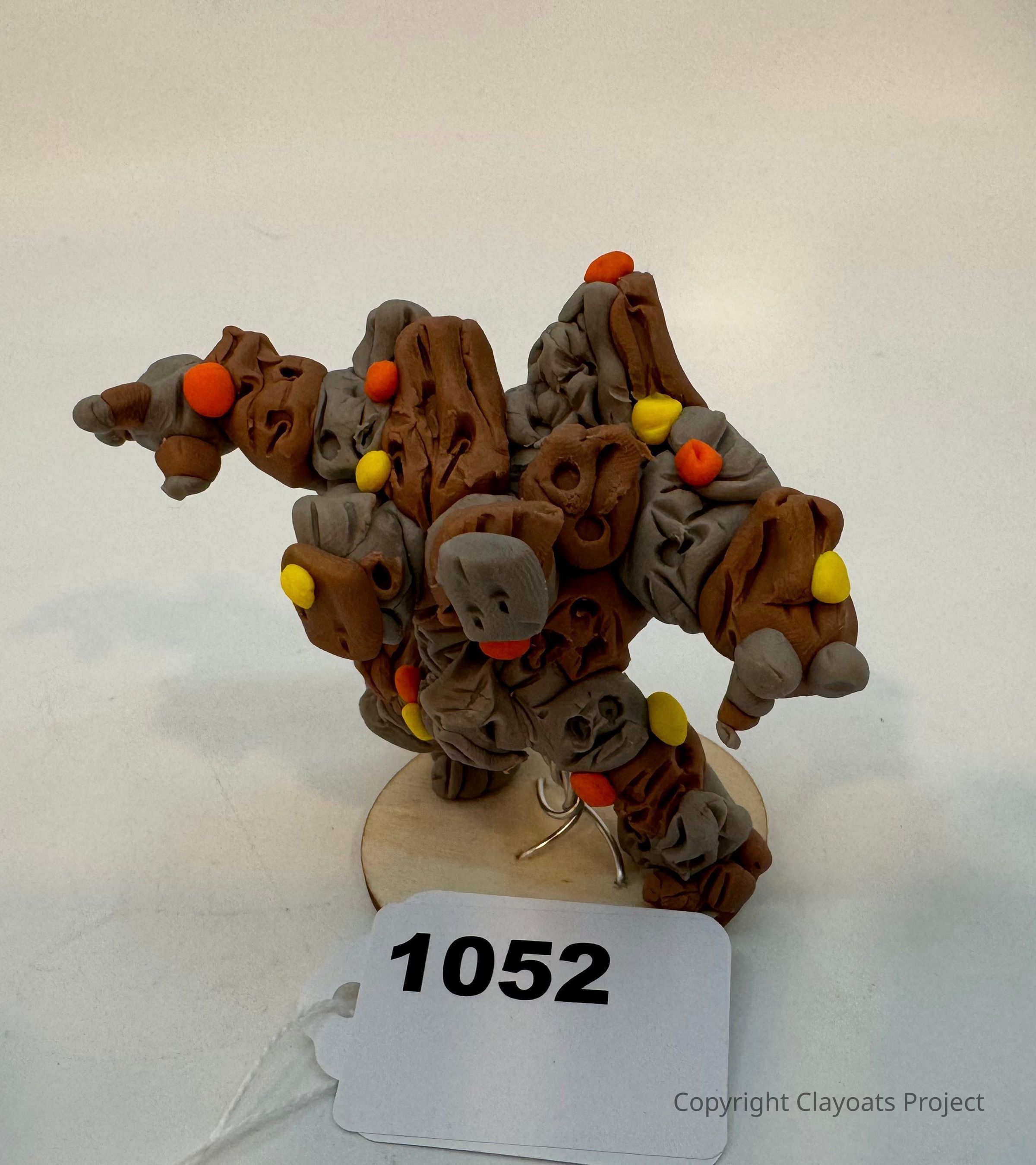 The image features a unique sculpture composed of folded and compressed clay pieces in brown and gray hues, adorned with small, circular orange and yellow accents, all mounted on a round wooden base evoking abstract, organic forms that suggest a sense of whimsical creativity and artistic playfulness in its intricate construction and design.