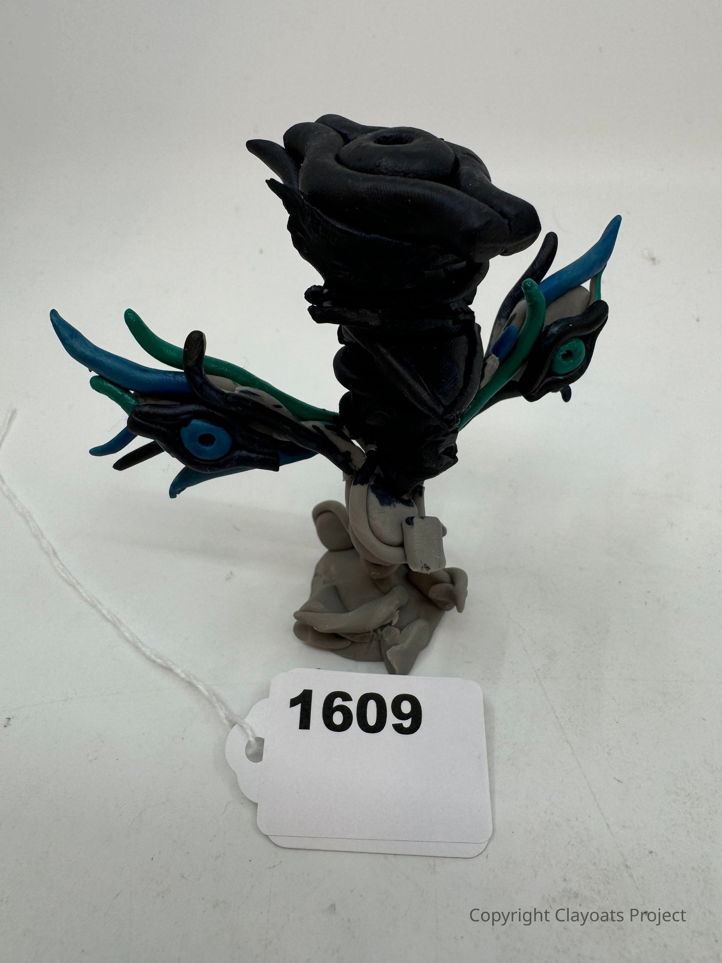 The image shows a sculpture made of dark and vibrant clay, featuring a central large black rose with outspread tentacle-like extensions in blue and green colors, creating an abstract and surreal aesthetic. The sculpture is placed on a light-colored surface. The intricate detailing on the sculpture, particularly on the tentacle extensions, suggests a creative and meticulous design. The white background contrasts with the colorful elements, highlighting the