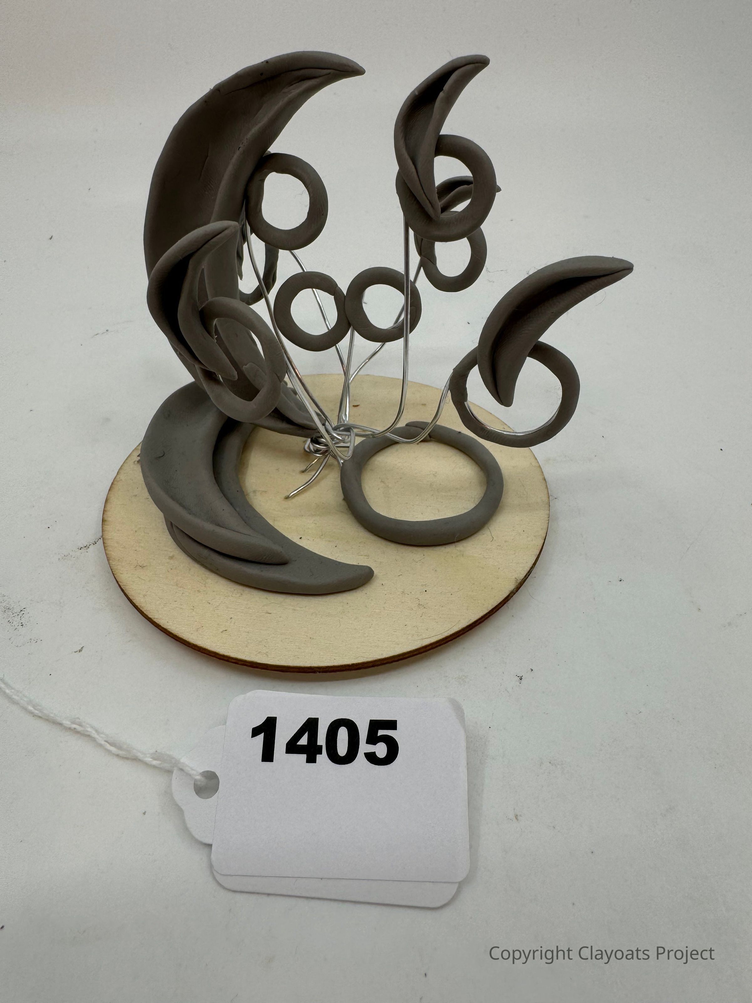 The image depicts an abstract sculpture composed of curved, crescent-shaped elements and circular loops mounted on a round wooden base, with intertwined metal wires creating a dynamic structure. The sculpture, which is grey in color, features an aesthetic reminiscent of organic forms such as leaves or waves. The use of mixed materials and creative design suggests it could be a modern art piece, inviting viewers