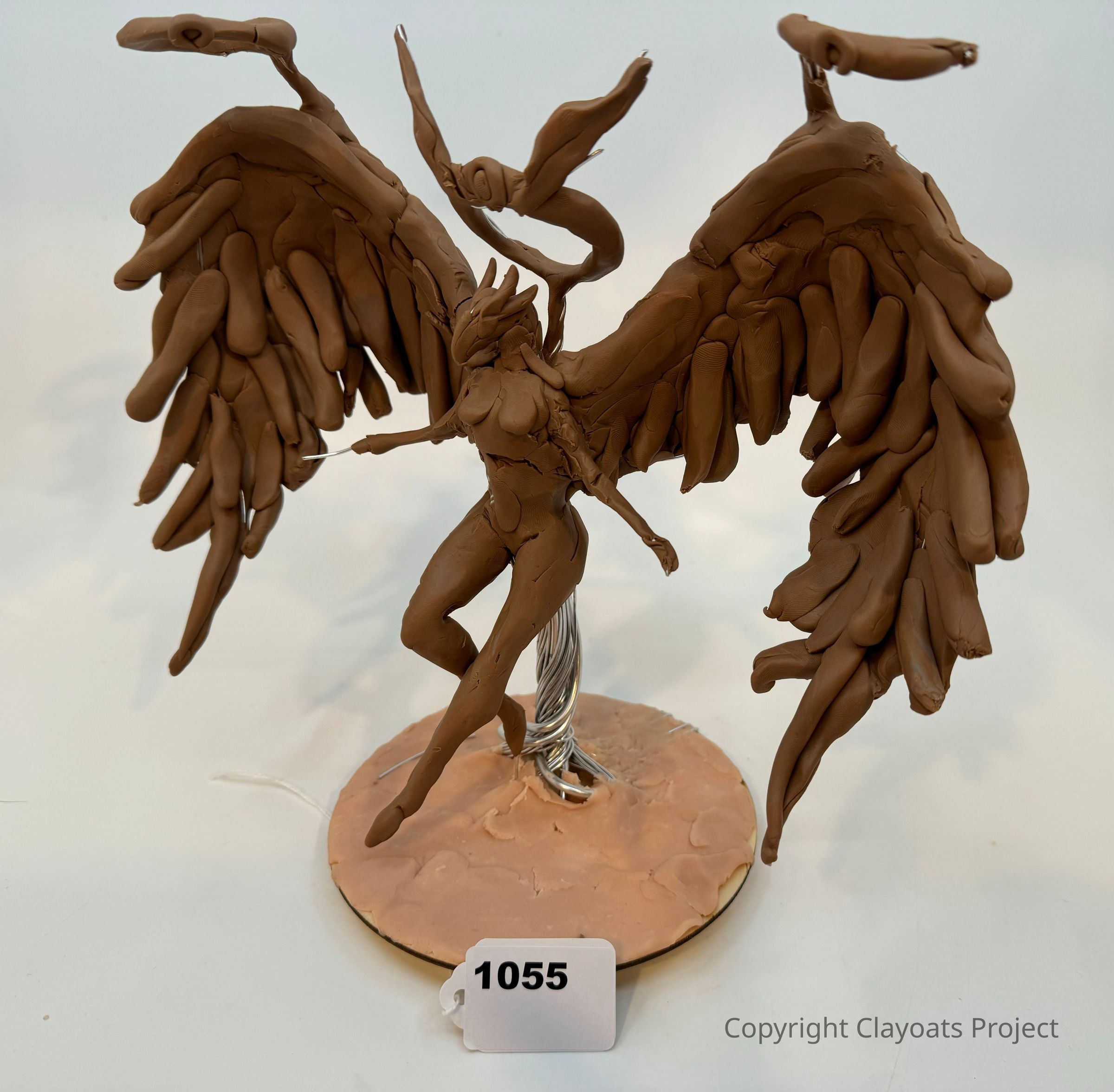 The image depicts a detailed clay sculpture of a winged figure, standing dynamically on a circular base, with large, feather-like wings extending outward in an expressive pose, while intricate features and flowing strands suggest movement;, and the entire sculpture is crafted with a reddish-brown clay, showcasing an impressive blend of artistic creativity and structural complexity, capturing a sense of fluidity and grace, as if the figure is in mid-flight or dance, with its meticulously crafted wings and