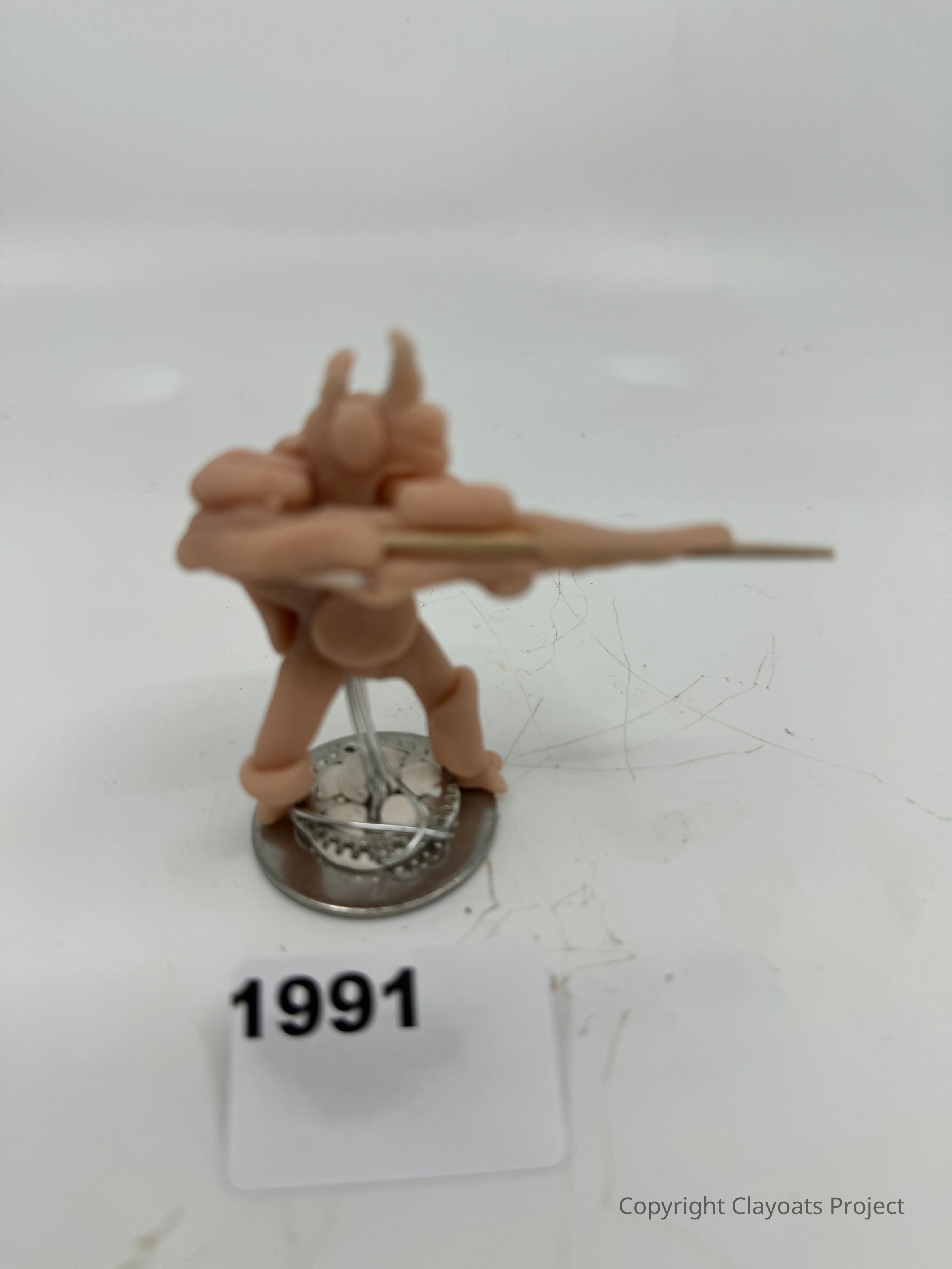 The image depicts a small figurine of a humanoid creature with distinct features such as a long weapon, poised in a dynamic stance. It is mounted on a circular metal stand, The background is plain, putting the focus entirely on the intricately detailed figure and its futuristic design elements. The lighting highlights the contours of the figure, accentuating its stance and weapon. The number suggests either the year of creation or a