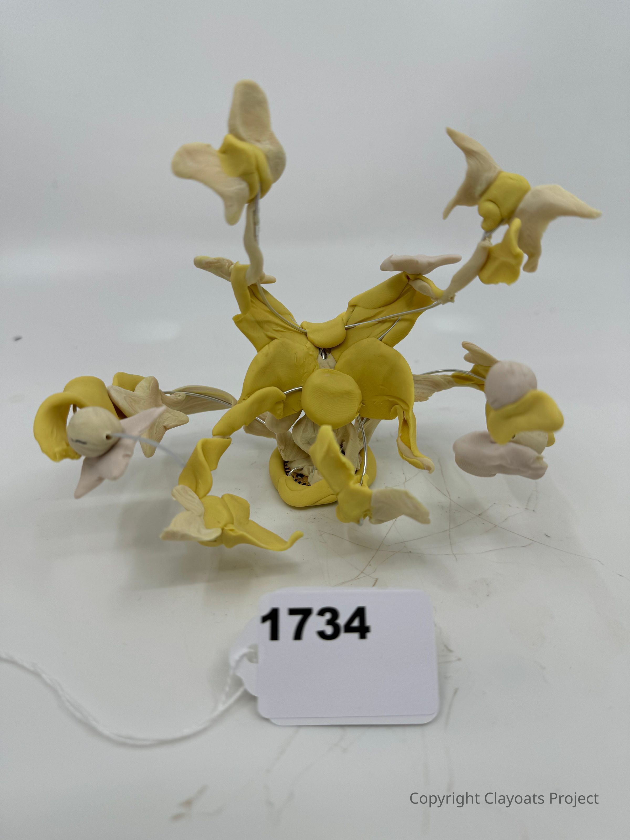 The image shows a detailed model of a human vertebral column, highlighted in yellow and beige, with several vertebrae prominently displayed in various orientations. Each vertebra is distinct, with some featuring spinous processes reaching upward or outward. The model rests on a plain surface, . The background is a neutral, smooth surface, allowing the intricate details of the vertebral model to stand out clearly