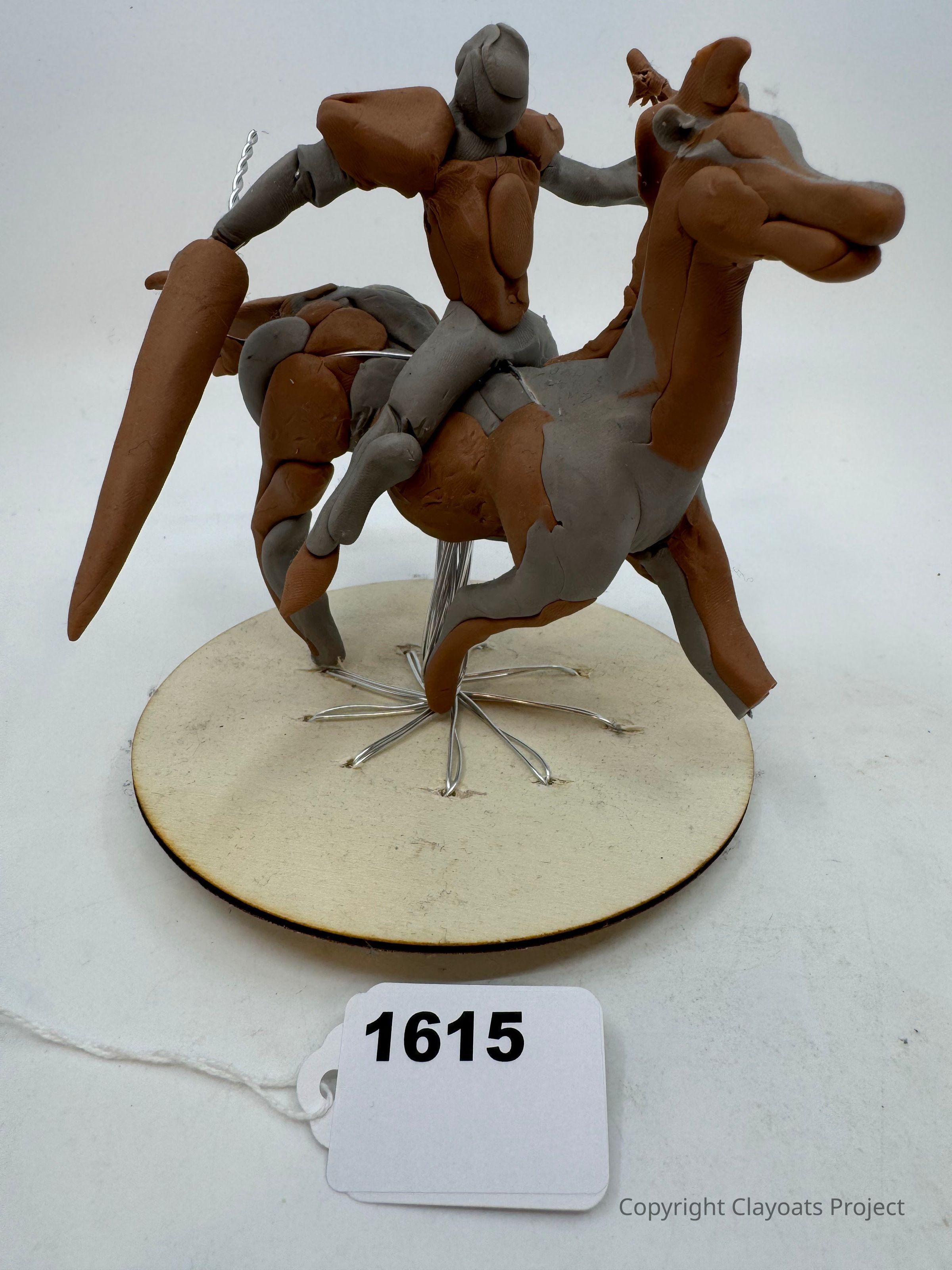 The image shows a detailed clay sculpture of a knight on horseback, crafted using gray and brown clay. The knight, equipped with armor and holding a lance, is poised atop the horse, which stands on a circular wooden platform. The sculpture employs wire supports for stability and detail. This dynamic composition captures the motion and elegance of a medieval jousting scene, showcasing the artist's skill