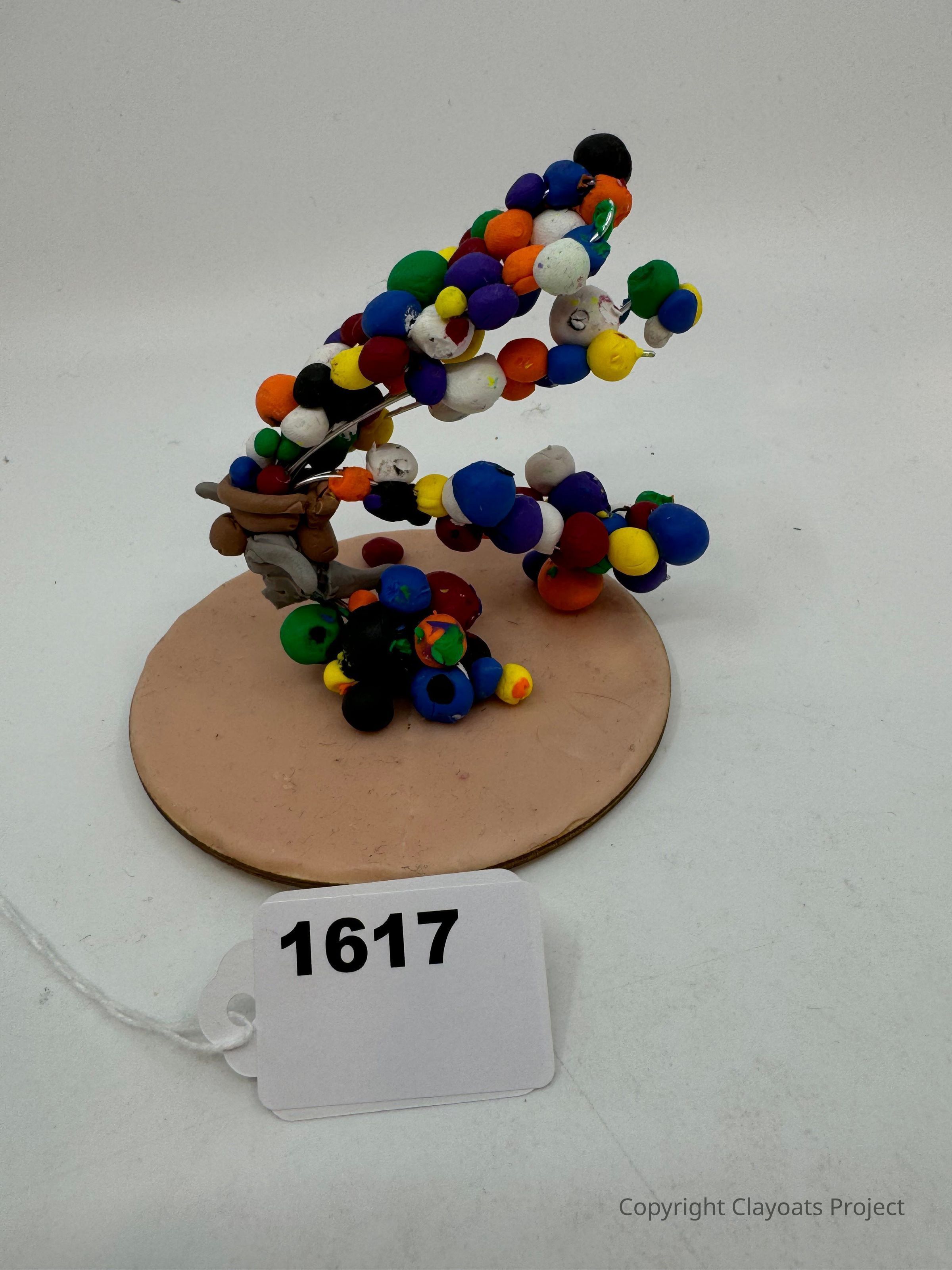 The image features a clay sculpture with a base, adorned by colorful balls made from clay attached to wire structures, creating a dynamic and whimsical form resembling an abstract tree or bouquet; the sculpture, vividly displaying a spectrum of colors including blue, red, yellow, green, orange, white, and black.