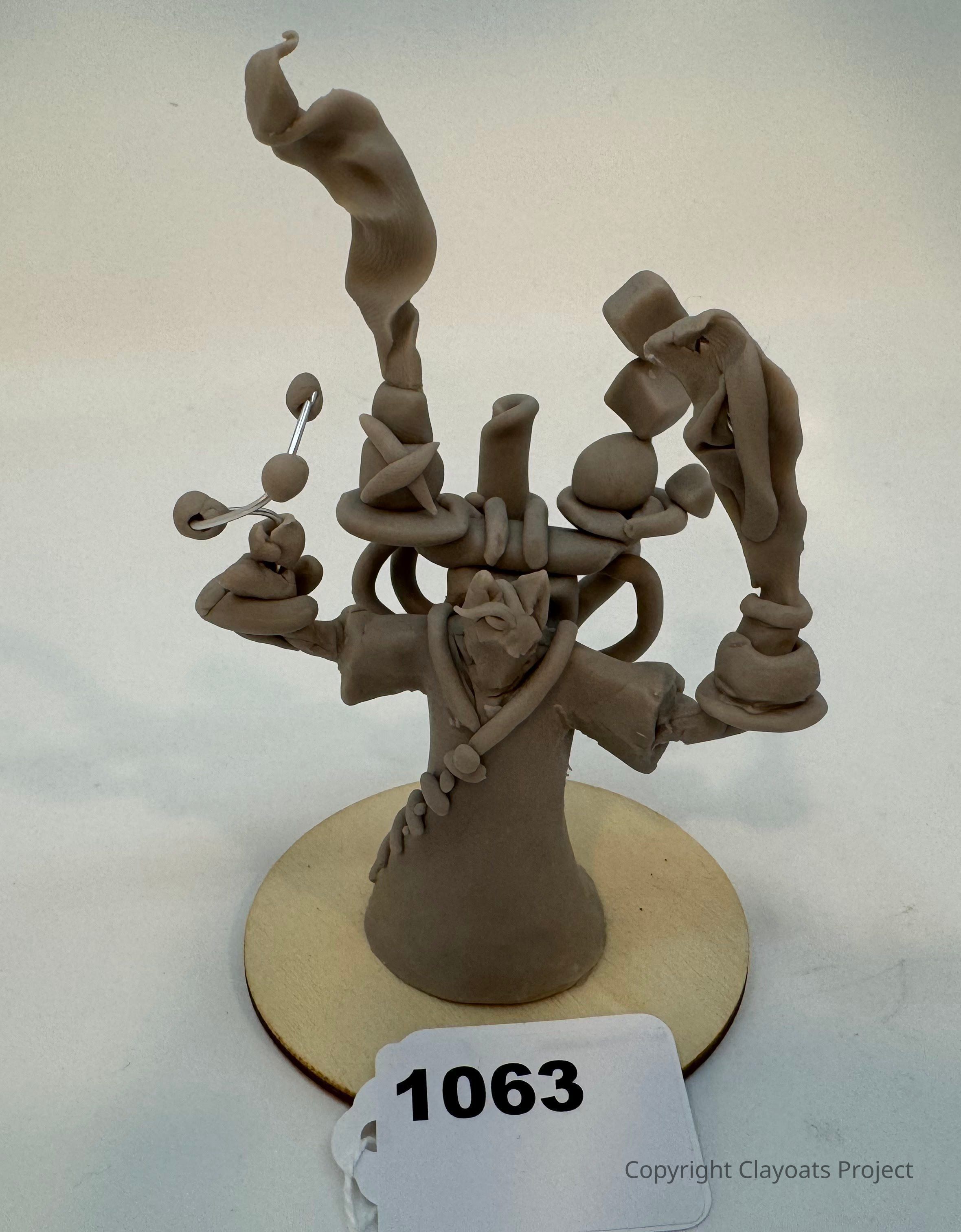 The image displays a unique clay sculpture set on a wooden base. The central figure appears to be abstract with multiple elongated and twisted appendages extending from its body. It is adorned with intricate, whimsical details including a sphere and curving forms reminiscent of organic and fantastical motifs. The base of the sculpture is circular, providing stability, and a tag marked "1063" is prominently placed in front. The composition suggests a dynamic, imaginative energy, showcasing the creativity behind the clay manipulation, appearing both playful