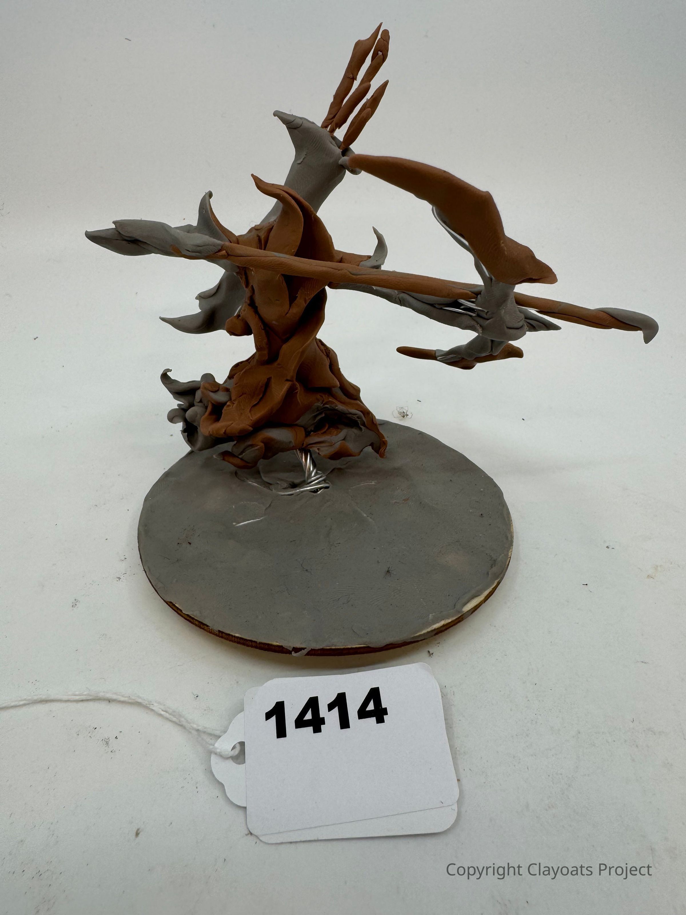 The image depicts a sculpture made from clay, featuring abstract, flowing forms that twist and reach upward, creating a dynamic sense of movement. It is set on a round base, giving it stability. The sculpture features a combination of earthy brown and gray tones, adding to its organic appearance.