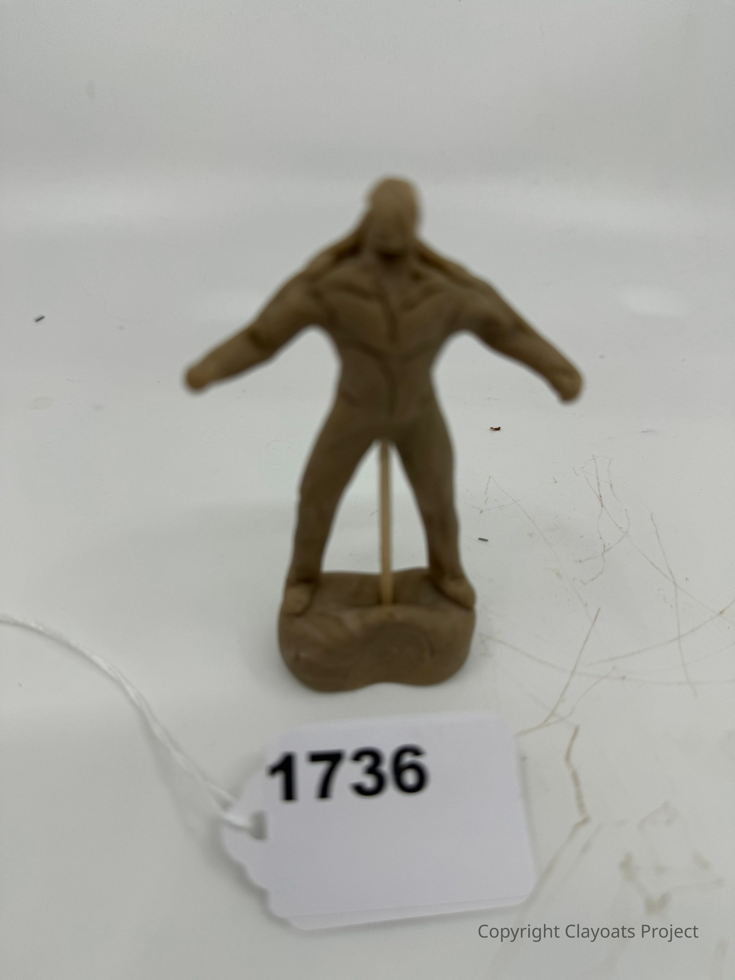 The image shows a small, brown clay figure standing with arms extended, placed on a matching base. The figure appears to be generic and lacks detailed features, representing a simple human form. The background is plain and light-colored, emphasizing the sculpture as the focal point of the image. Additionally, faint scratches or marks can be seen on the surface beneath the figure, adding to